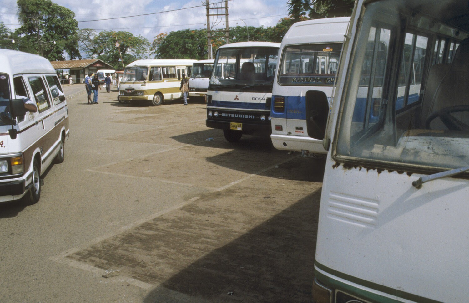 Paramaribo, overtocht over de Surinamerivier, op de kade van Meerzorg; lokale bussen