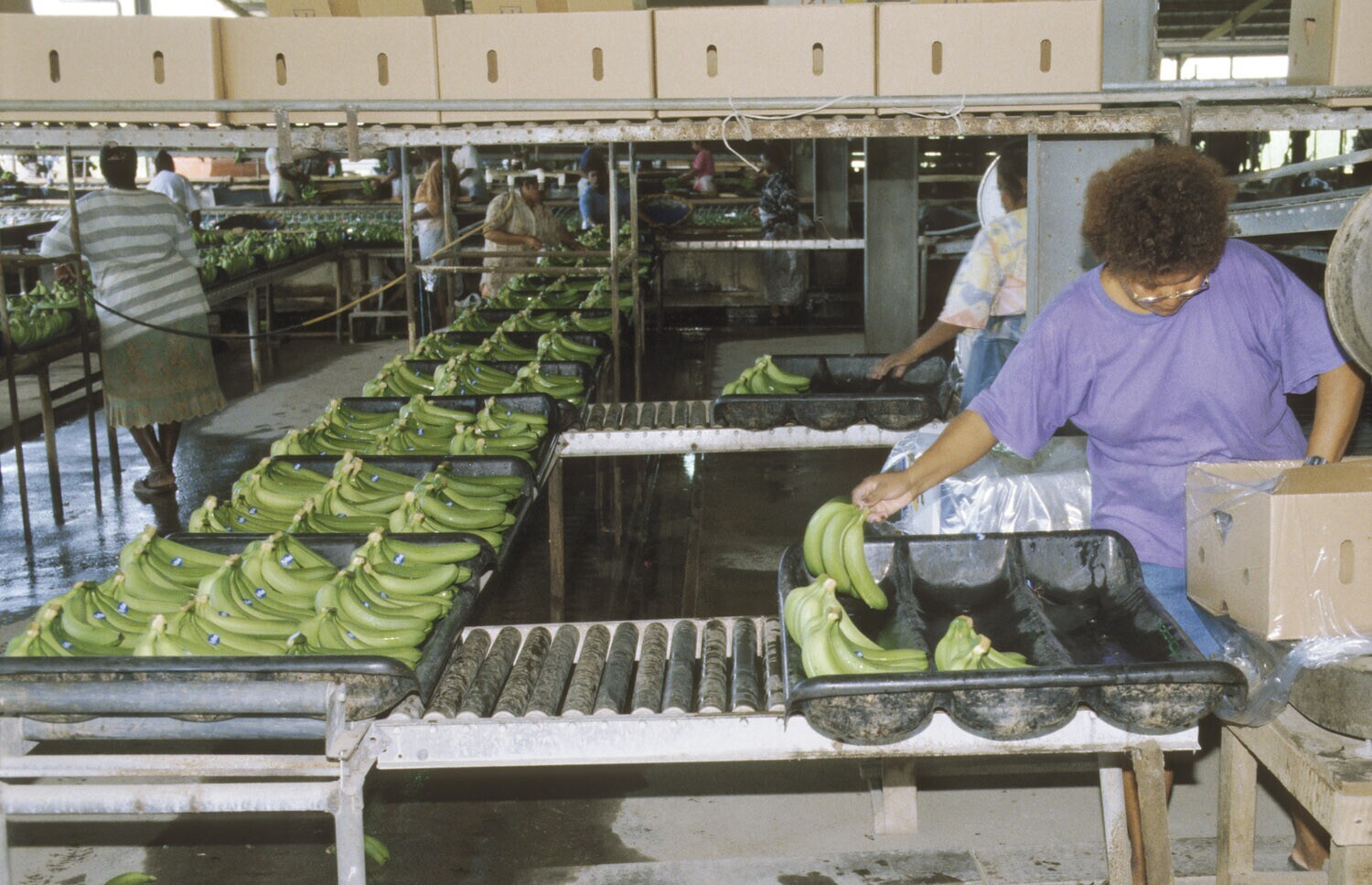 Uitkijk, ten zuidwesten van Paramaribo; bananenplantage Surland; drogen van bananen voordat ze worden verpakt