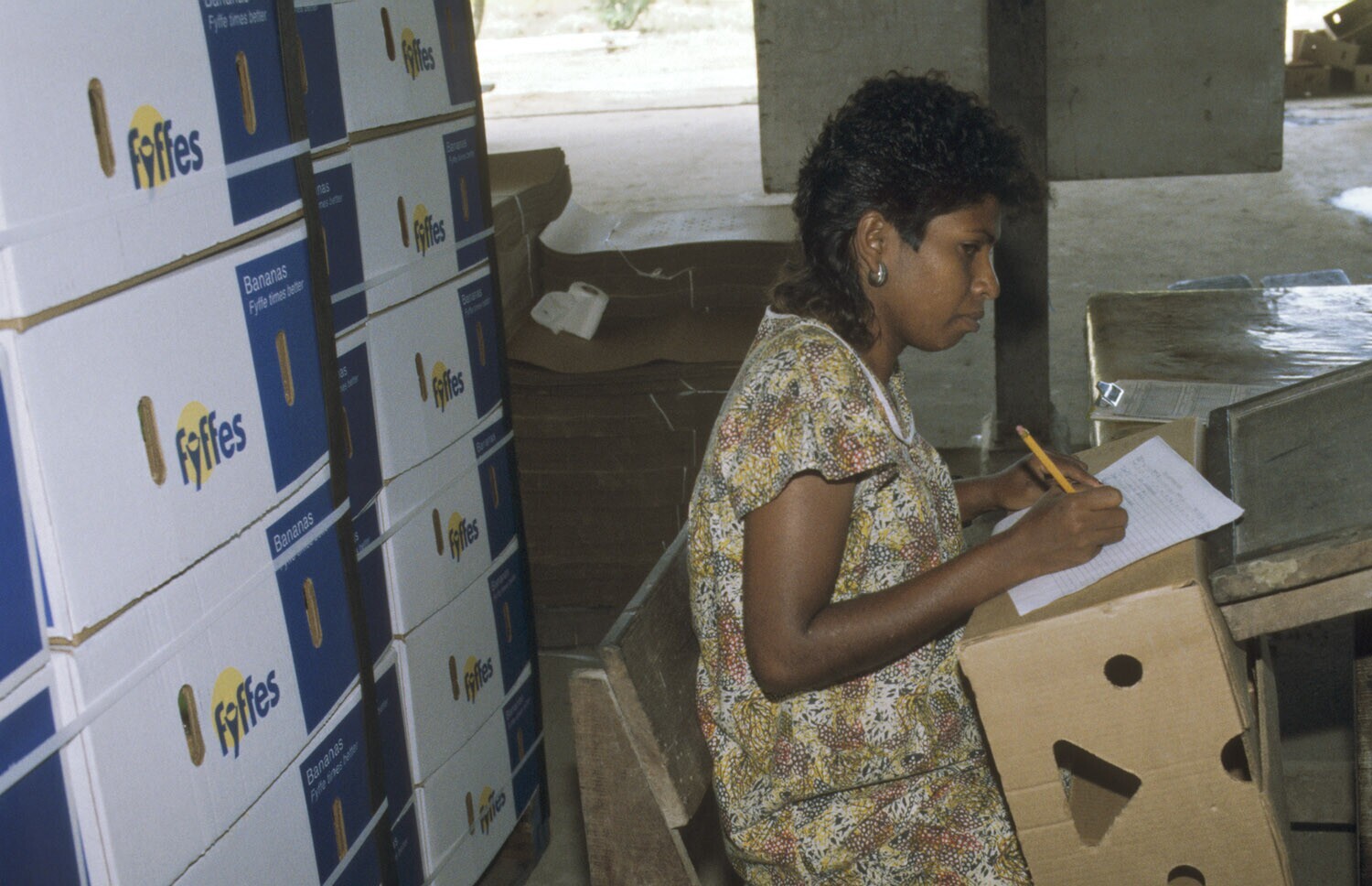 Uitkijk, ten zuidwesten van Paramaribo; bananenplantage Surland; vrouw telt dozen