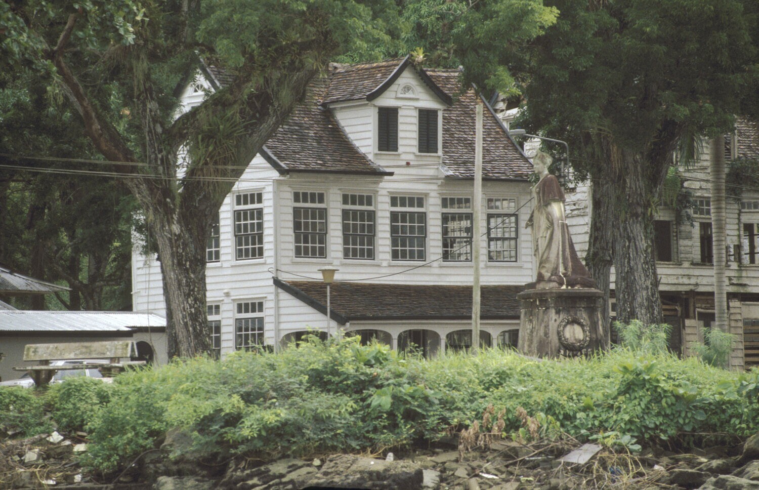 Paramaribo; vanaf het water; huidige kantoor van het surinaams Museum (standbeeld Wilhelmina?)