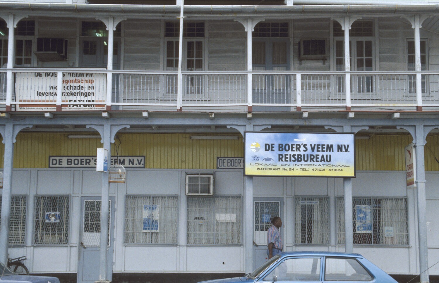 Paramaribo; Waterkant; gevel kantoorcomplex; opschrift: De Boers Veem BV. Reisbureau