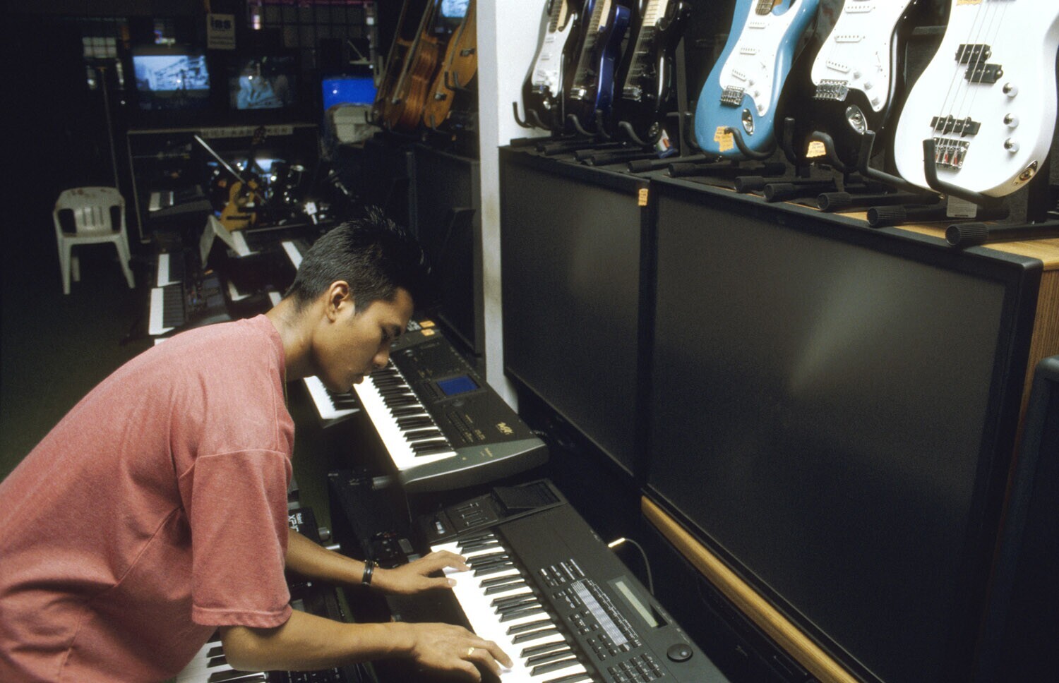 Paramaribo; interieur winkel muziek instrumenten; klant probeert electr. orgel