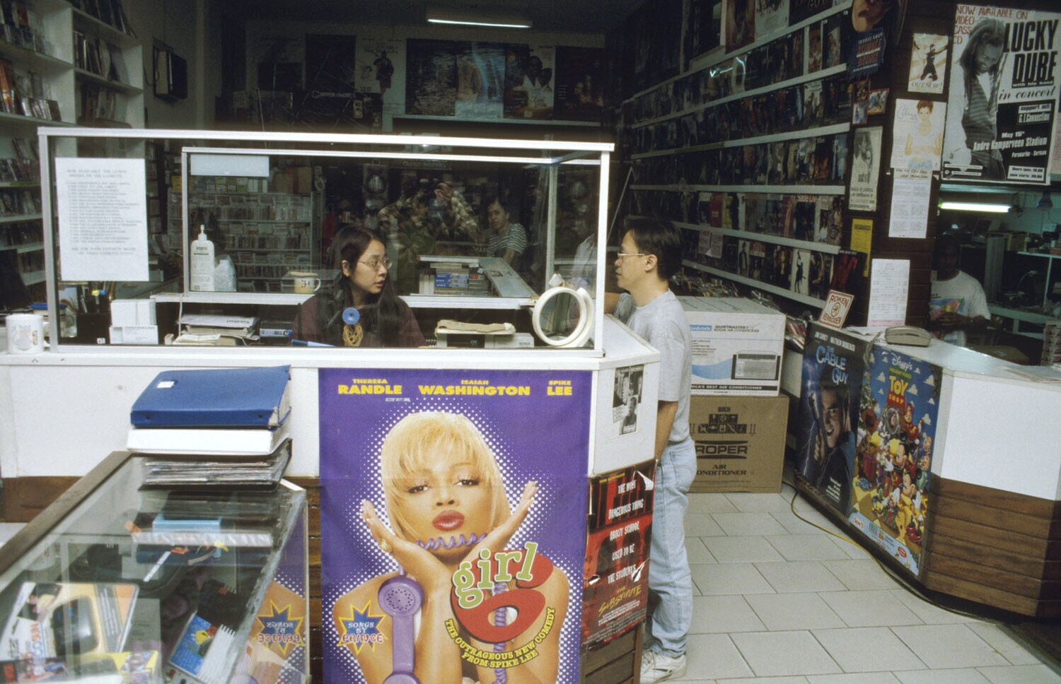 Paramaribo; interieur winkel met electr. muziekinstrumenten; de kassa en platen en cd's