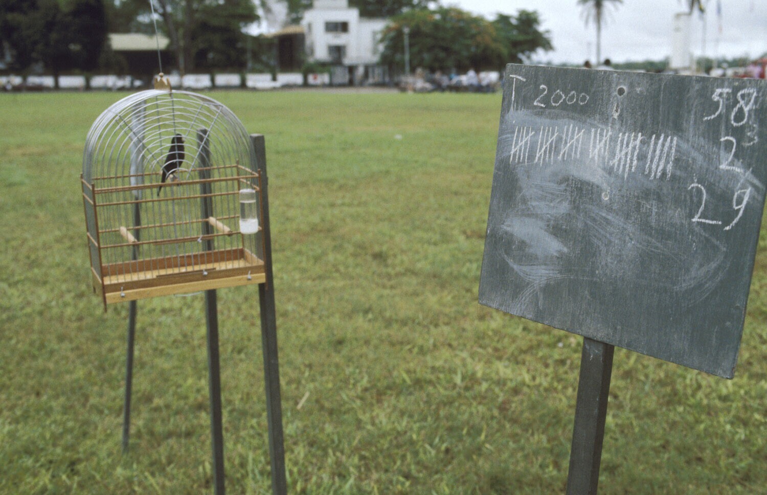 Paramaribo, Onafhankelijkheidsplein; zangvogelwedstrijd; vogelkooitje en telbord