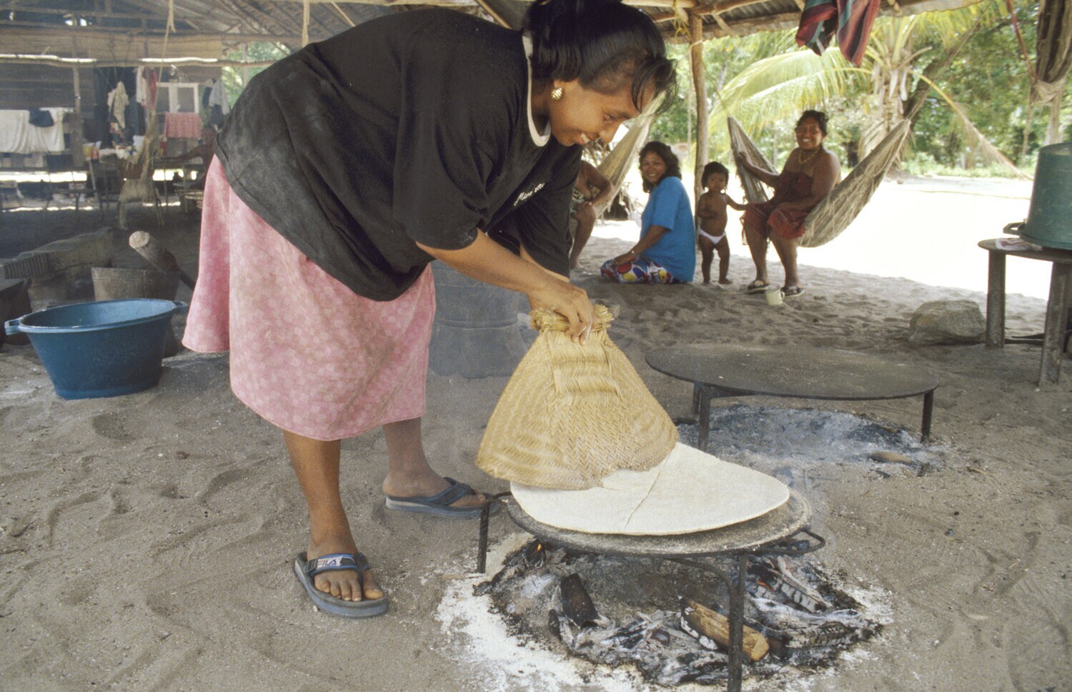 Galibi, Marowijnerivier; vrouw bakt cassavebrood op houtvuur in soort van centrale keuken