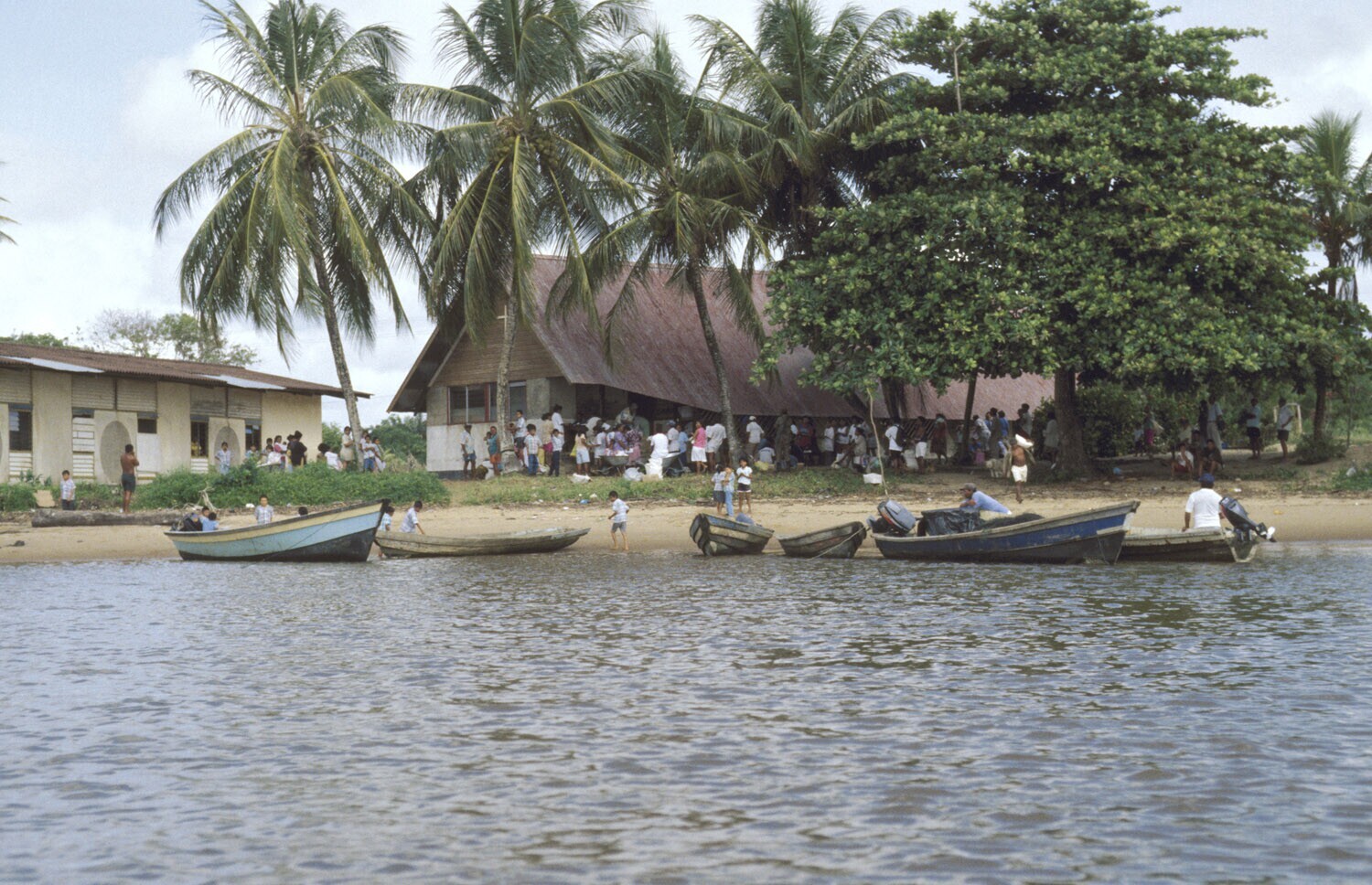 Galibi, Marowijnerivier, Christiaankondre; kustlijn met visserboten en school op de achter­grond