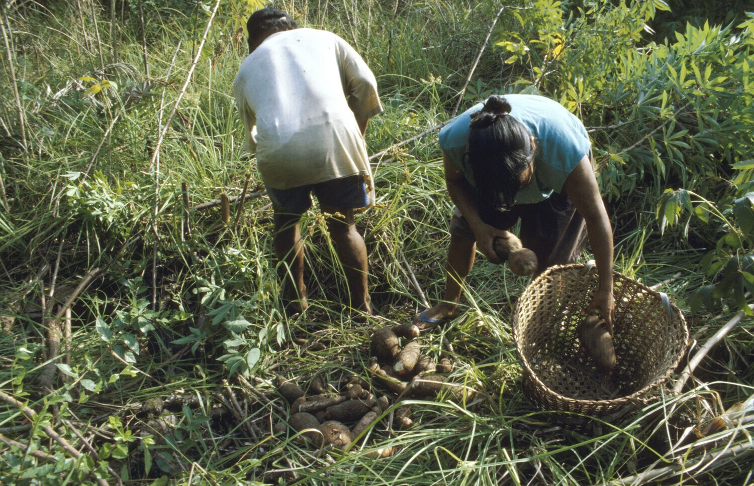Galibi, Marowijnerivier; vullen van mand met geoogste cassave