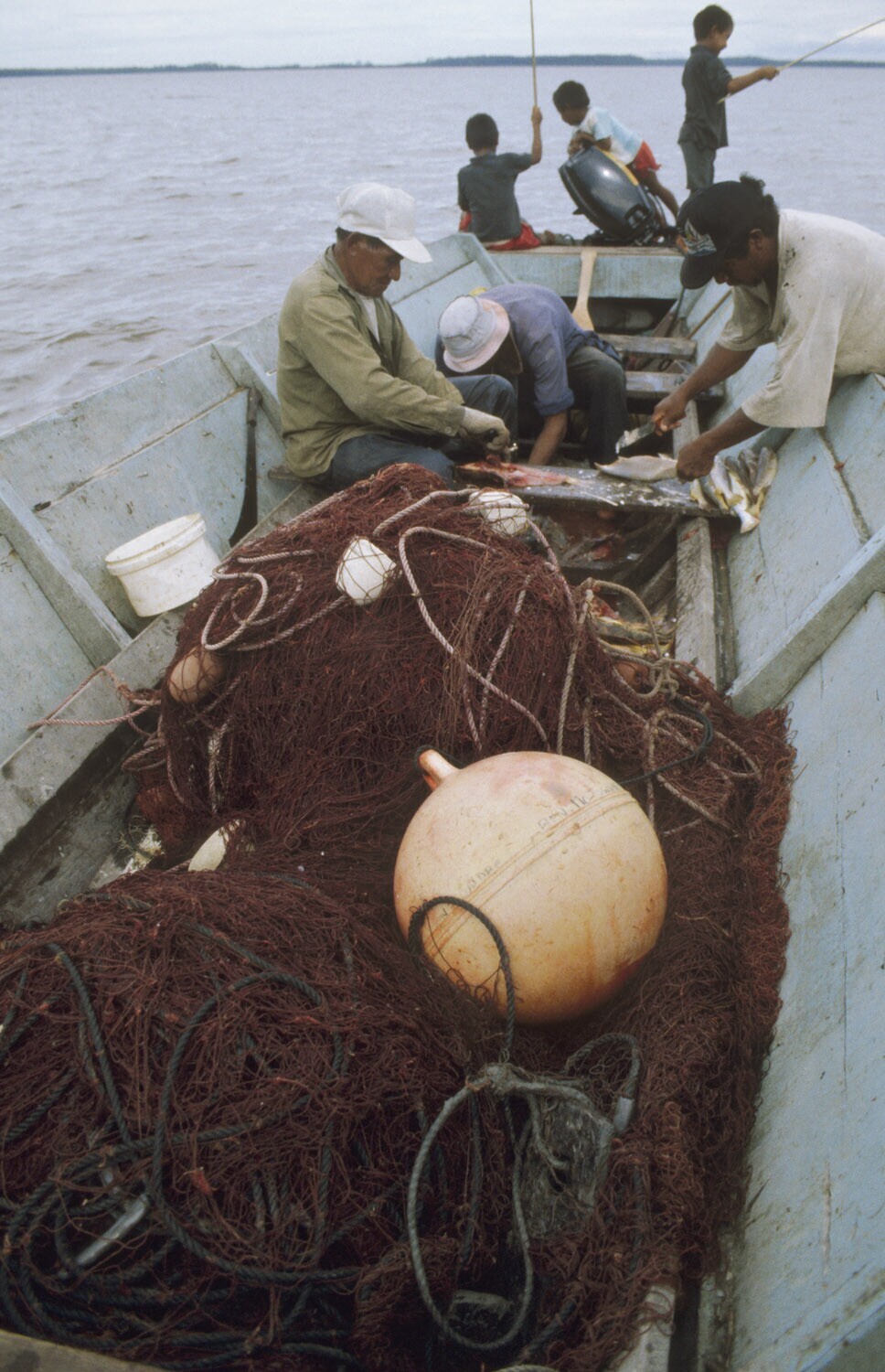 Galibi, Marowijnerivier; in de boot schoonmaken van net gevangen vis