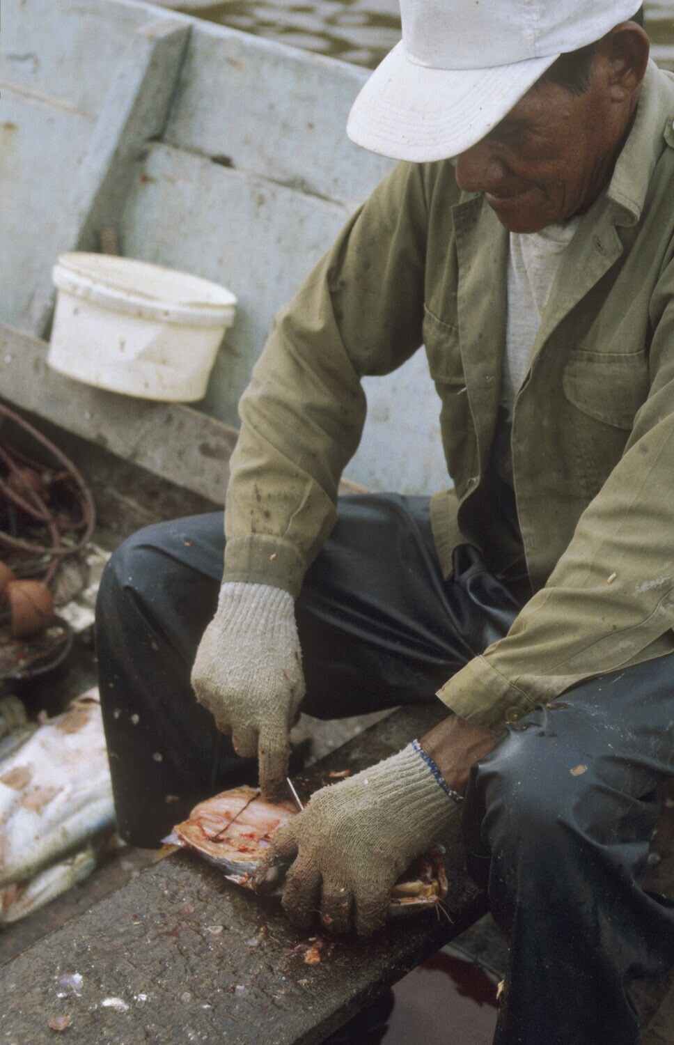 Galibi, Marowijnerivier; in de boot schoonmaken van net gevangen vis