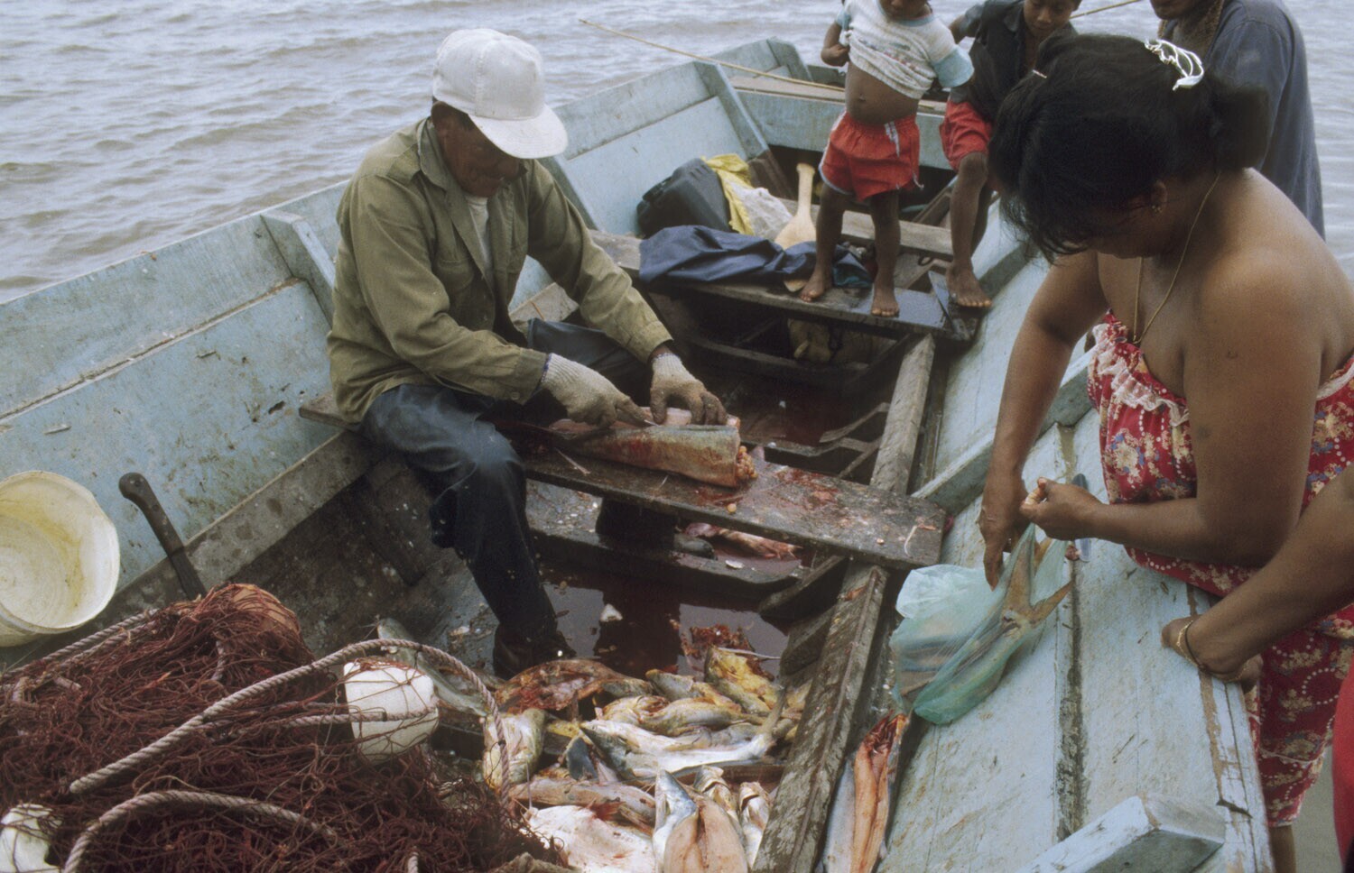 Galibi, Marowijnerivier; in de boot schoonmaken van net gevangen vis; vrouw koopt vis