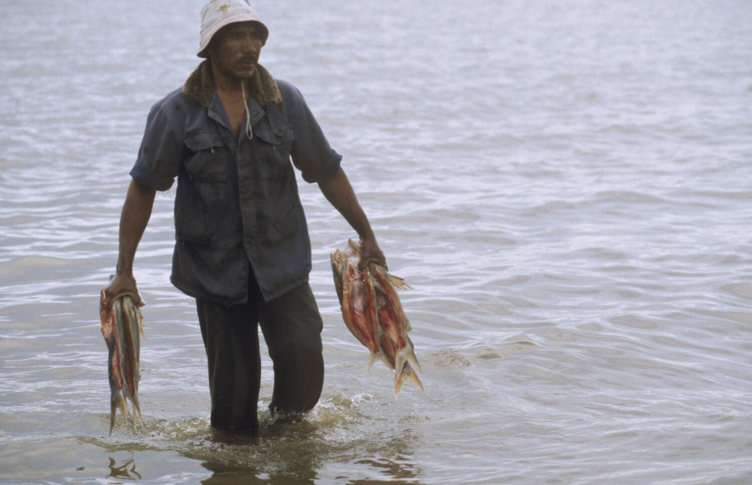 Galibi, Marowijnerivier; net schoongemaakte vis wordt in de rivier afgespoeld