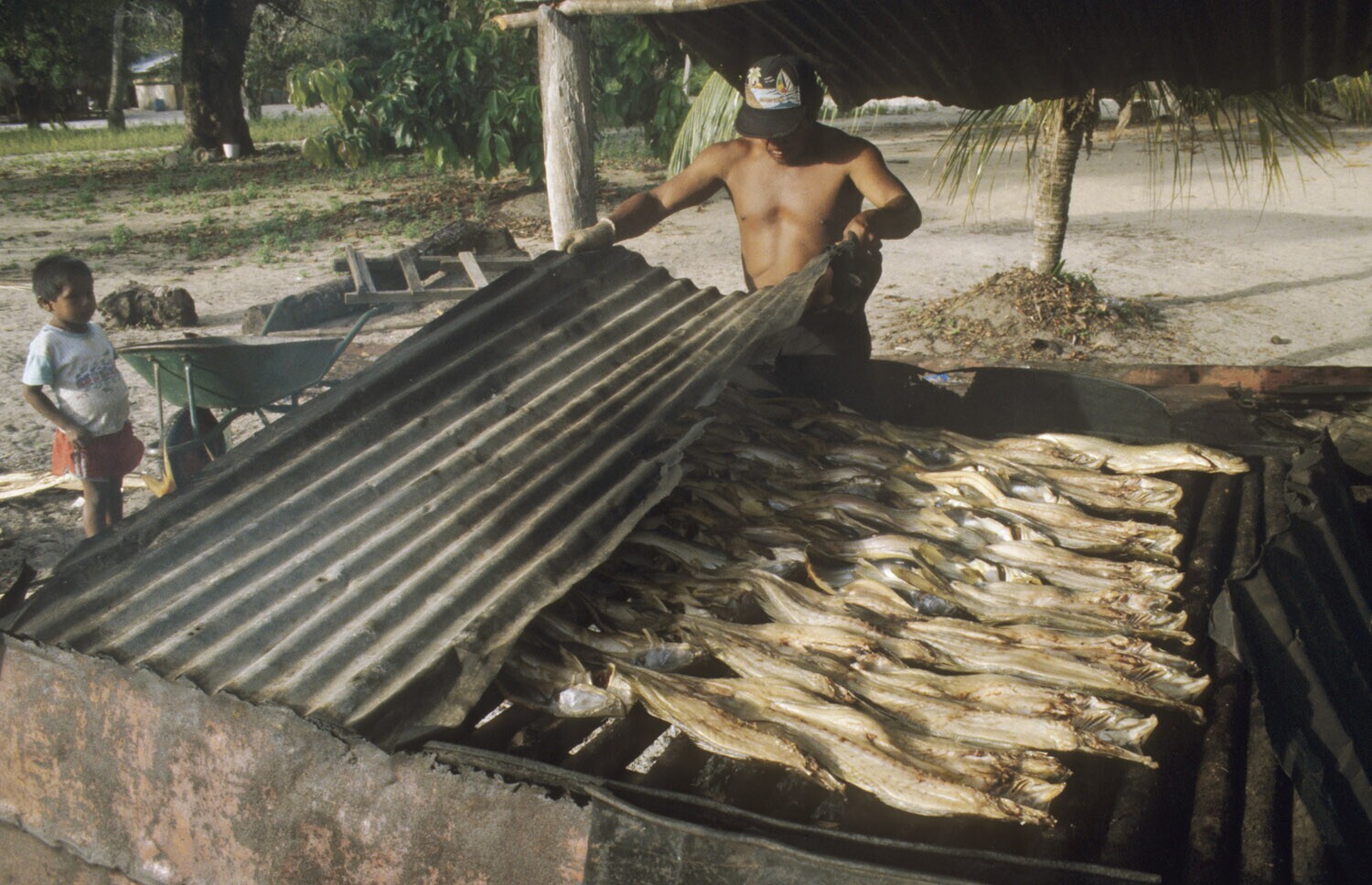 Galibi, Marowijnerivier; roken van vis ten behoeve van conservering; zij hebben vergunning om 2x per week de vis op de markt in St. Laurent (Frans Guyana) te verkopen