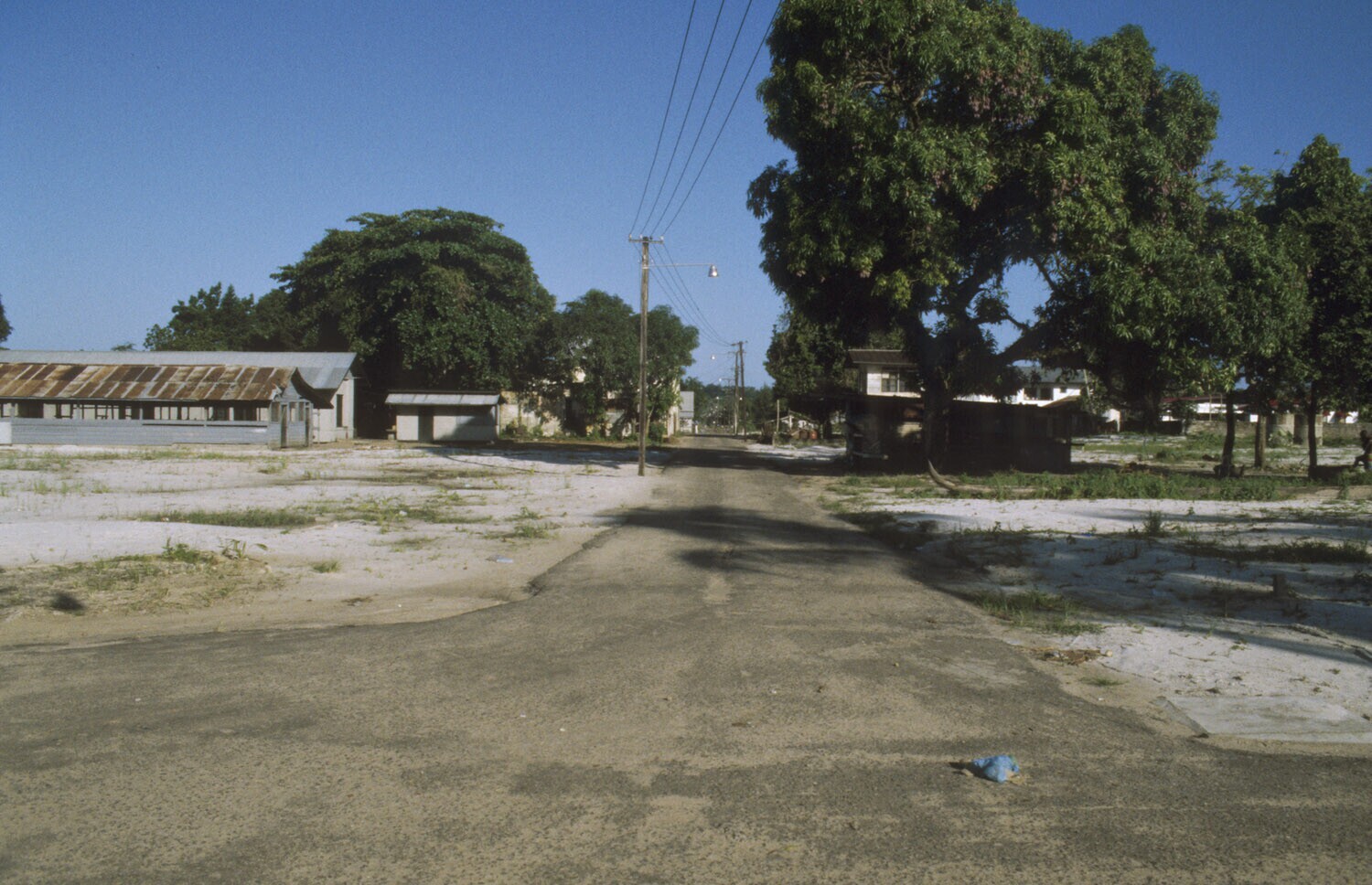 Albina, Marowijnerivier; straatbeeld; oude weg van Paramaribo naar haven; hier veel kapot geschoten tij­dens de binnenlandse oorlog