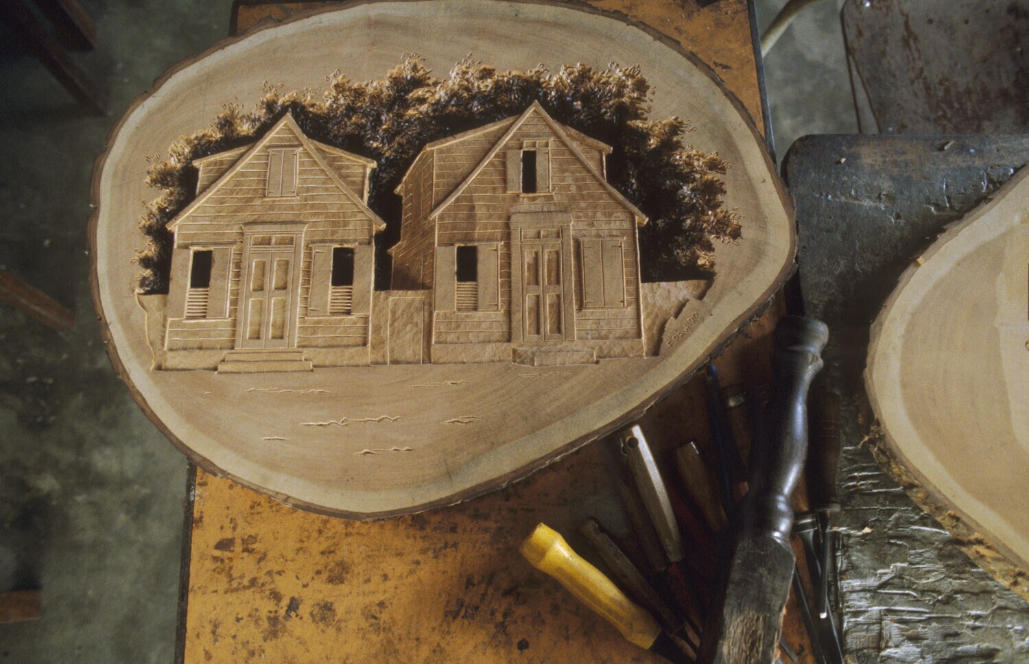 Paramaribo; houtsnijder; voorbeeld van een sierpaneel