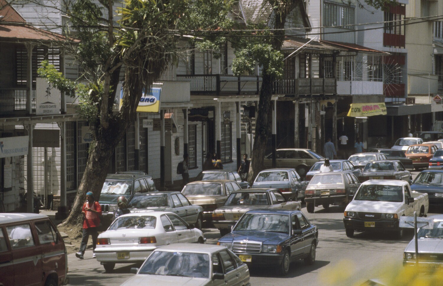 Paramaribo, straatbeeld, autodrukte bij hotel Krasnapolski