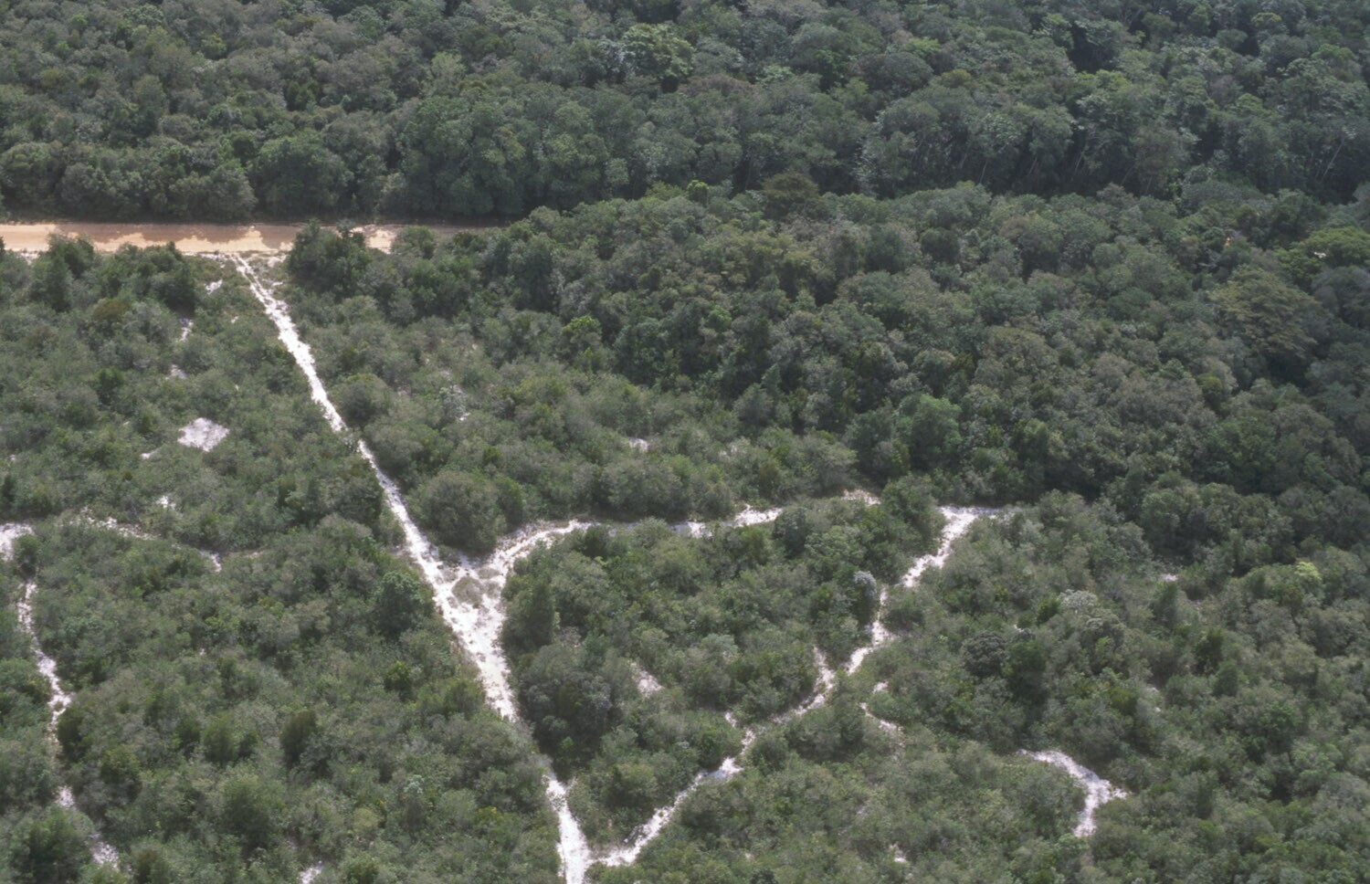 Luchtfoto van het regenwoud, het gekapte hout wordt via de wegen getransporteerd, omgeving Zanderij