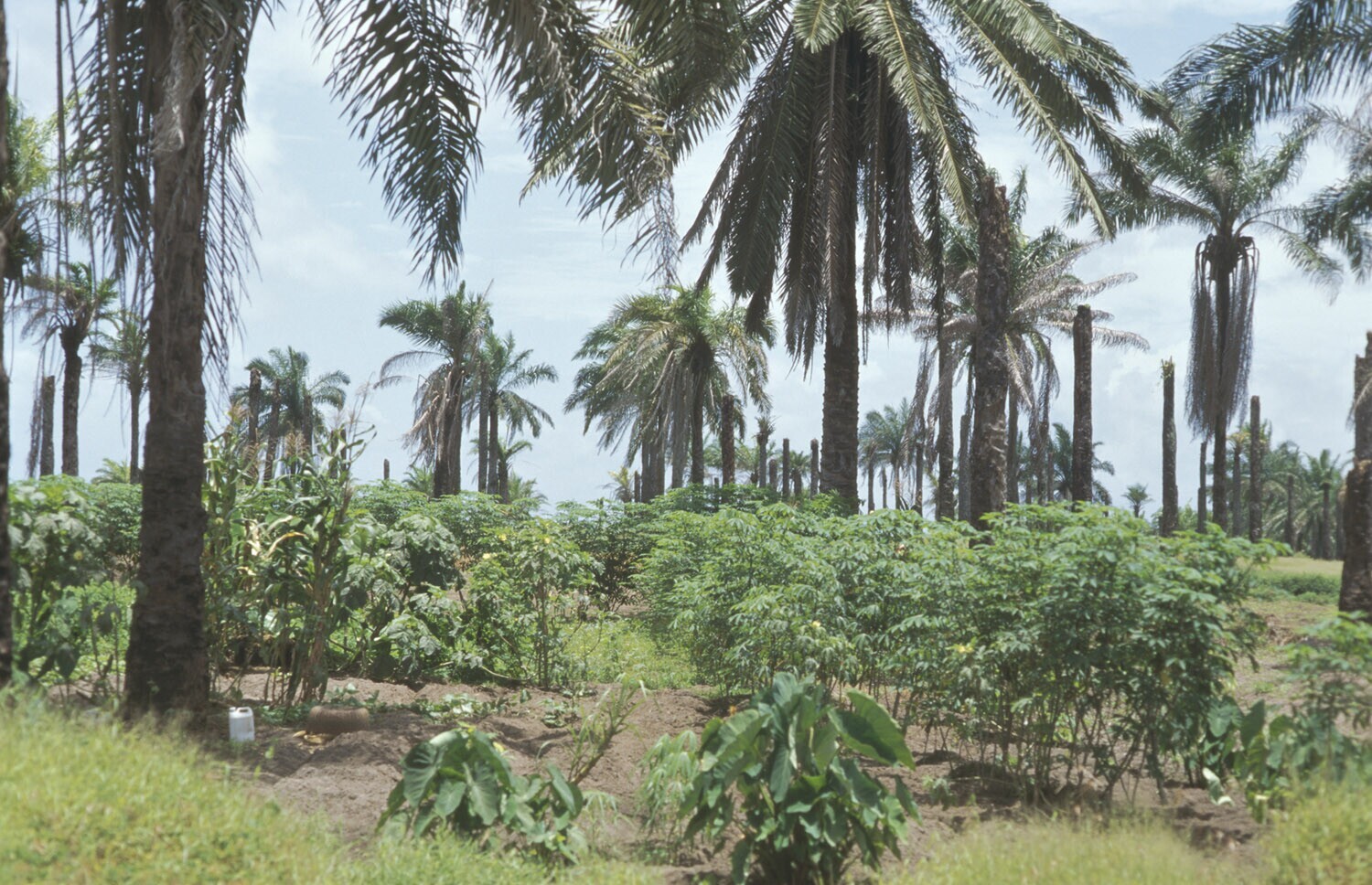 Een oliepalmplantage van dichtbij waar, door een plotselinge ziekte, bijna alle toppen van de bomen waren weggevreten