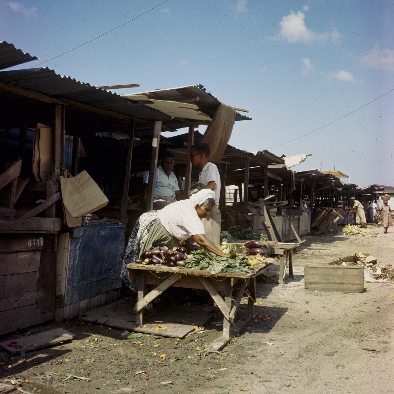 Hindoestaanse vrouw bij een groentekraam waar o.a. aubergines verkocht worden.