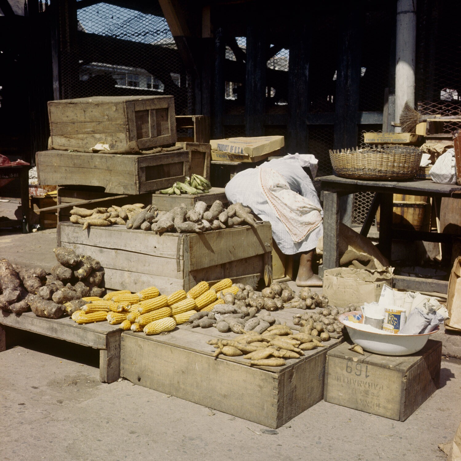 Markt in Paramaribo. Op de hoge kist Zoete aardappels, Yams (Colocasia Esqulenta), lager liggen: Tajer, Maïs, Chineese Tajer en zoete aardappelen.