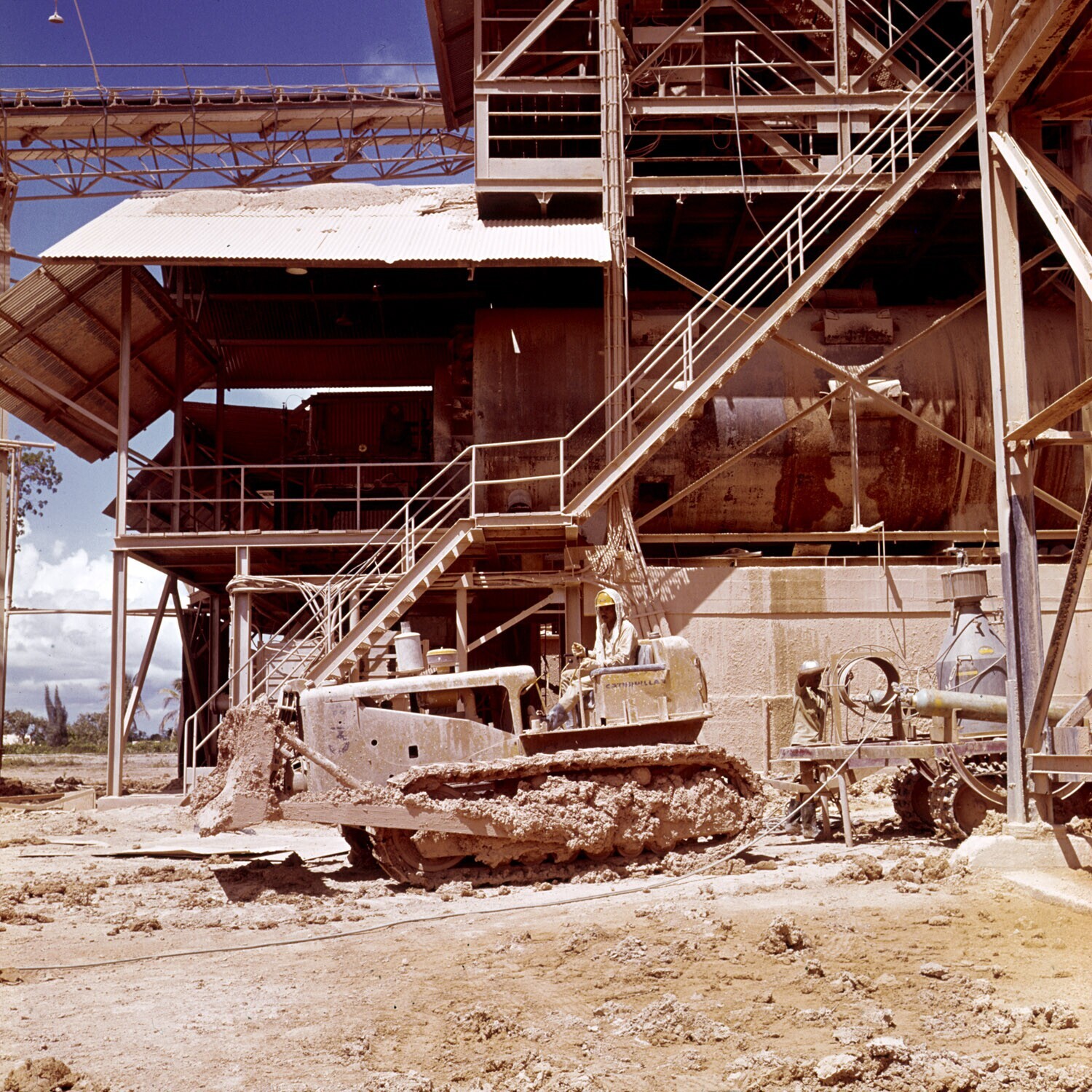 Buldozer bij complex van transportbanden.