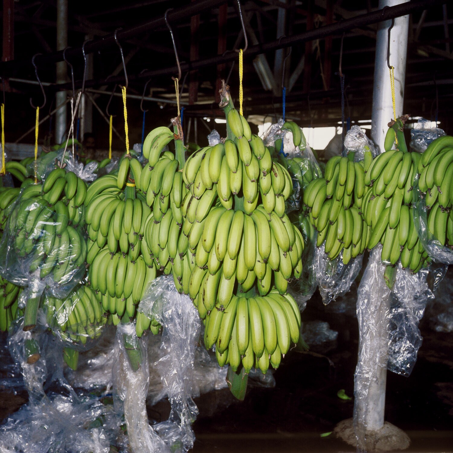 In de sorteerloods worden de trossen voor verdere bewerking aan rekken opgehangen.