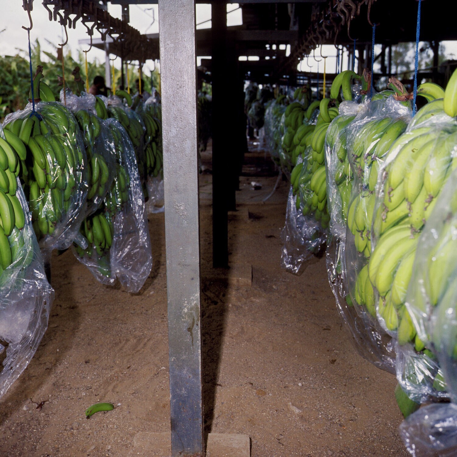 In de sorteerloods worden de trossen voor verdere bewerking aan rekken opgehangen.