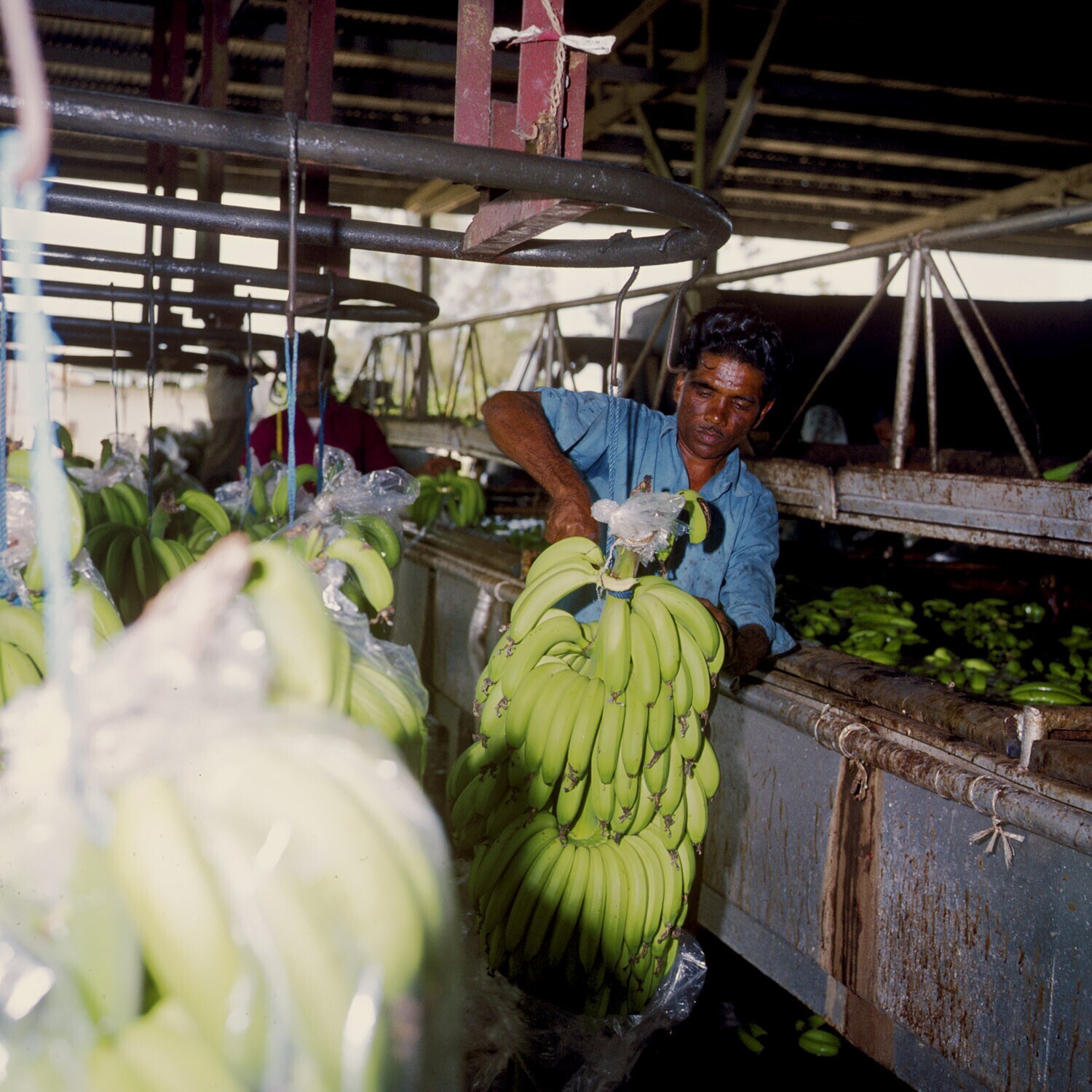 Eén van de arbeiders die de kammen van de tros los- snijdt en ze in de wasbak naast zich deponeert.