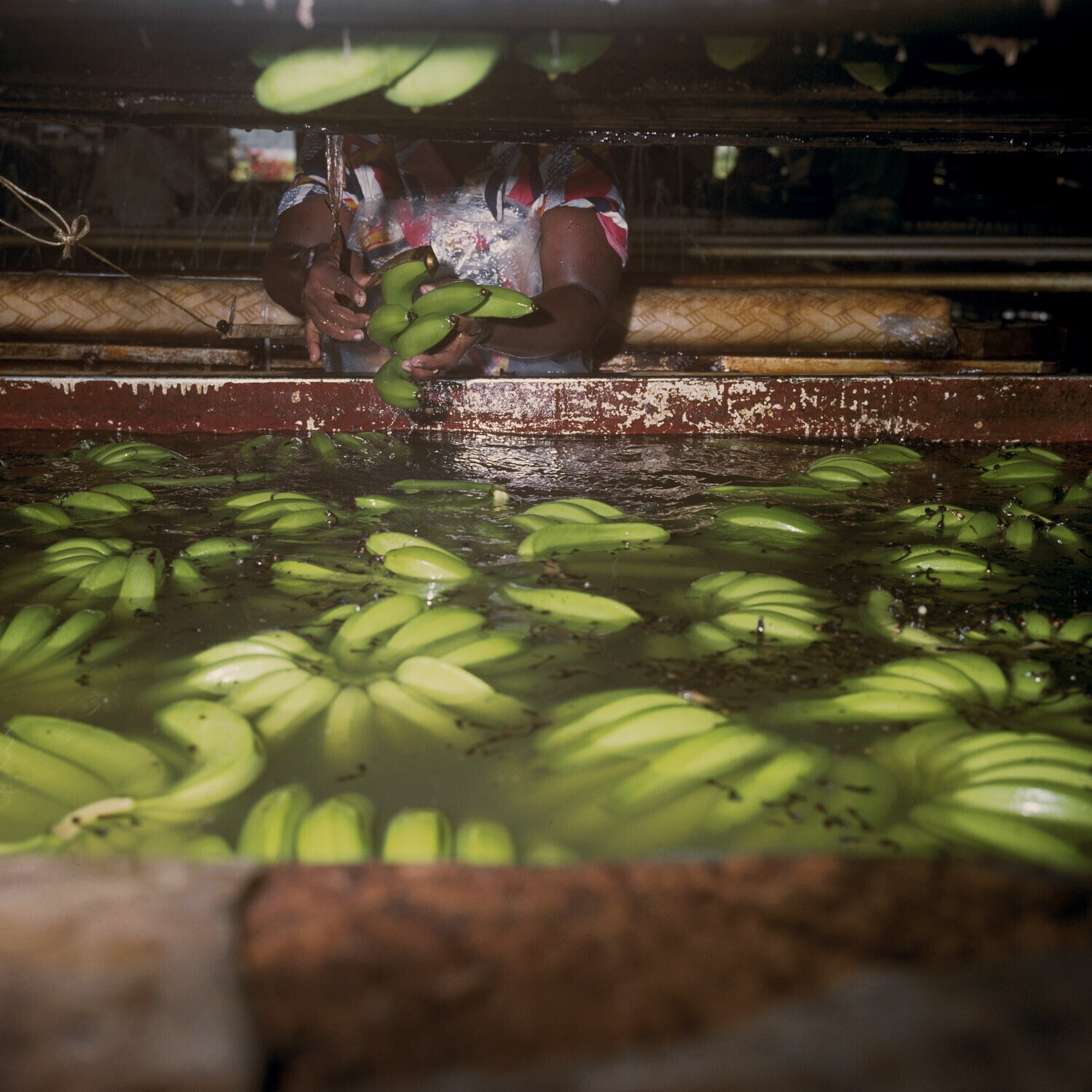 De bananentrossen in de wasbak waarin ze met water gewassen worden.