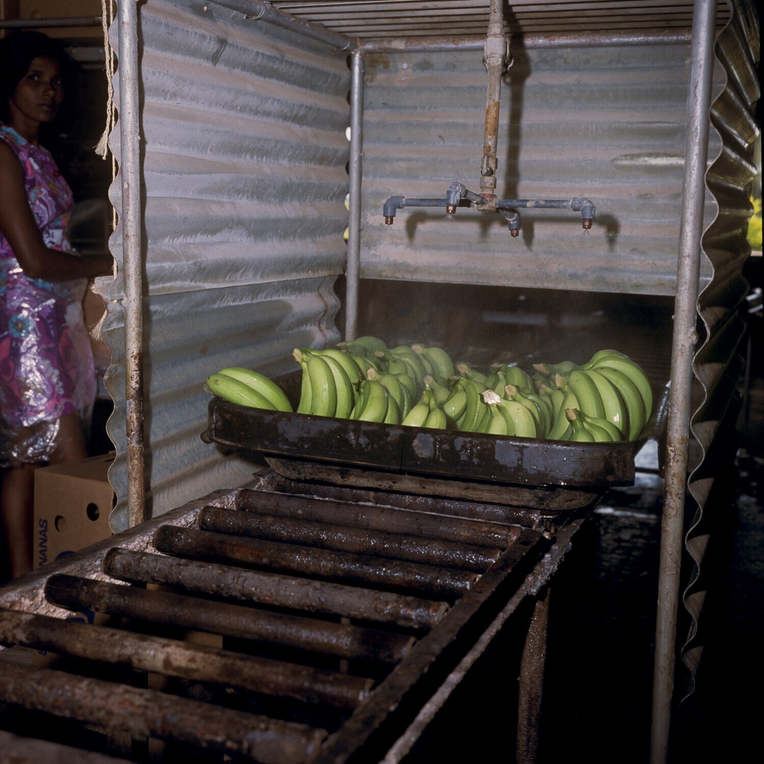 Een bak met bananen wordt gefumigeerd. Dat is het behandelen met gasvormige bestrijdingsmiddelen.