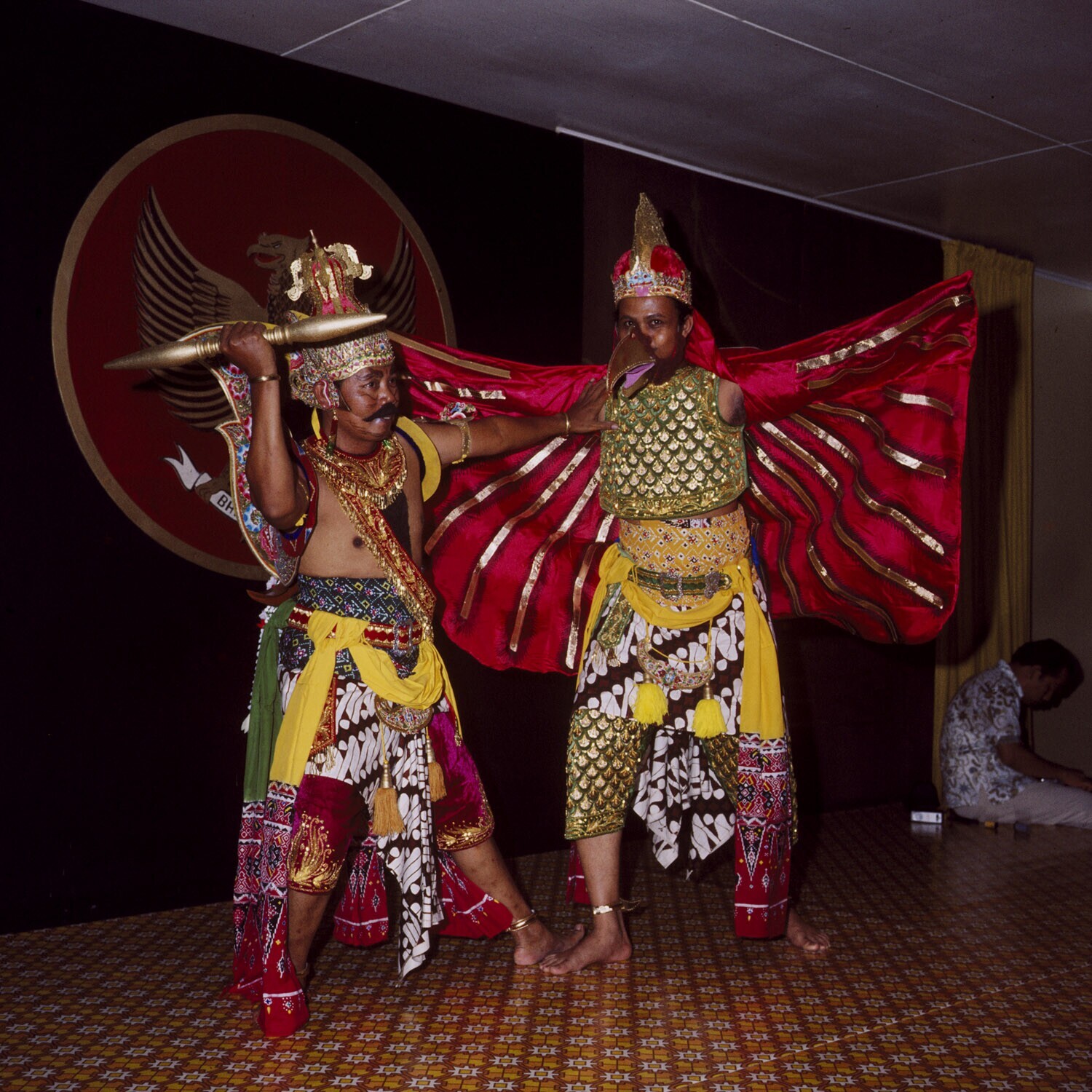 Javaanse Surinamers. De Javaanse dansinstructeur geeft instructie. De dans beeldt uit de reuze vogel in gevecht met Rahwana Djentan.