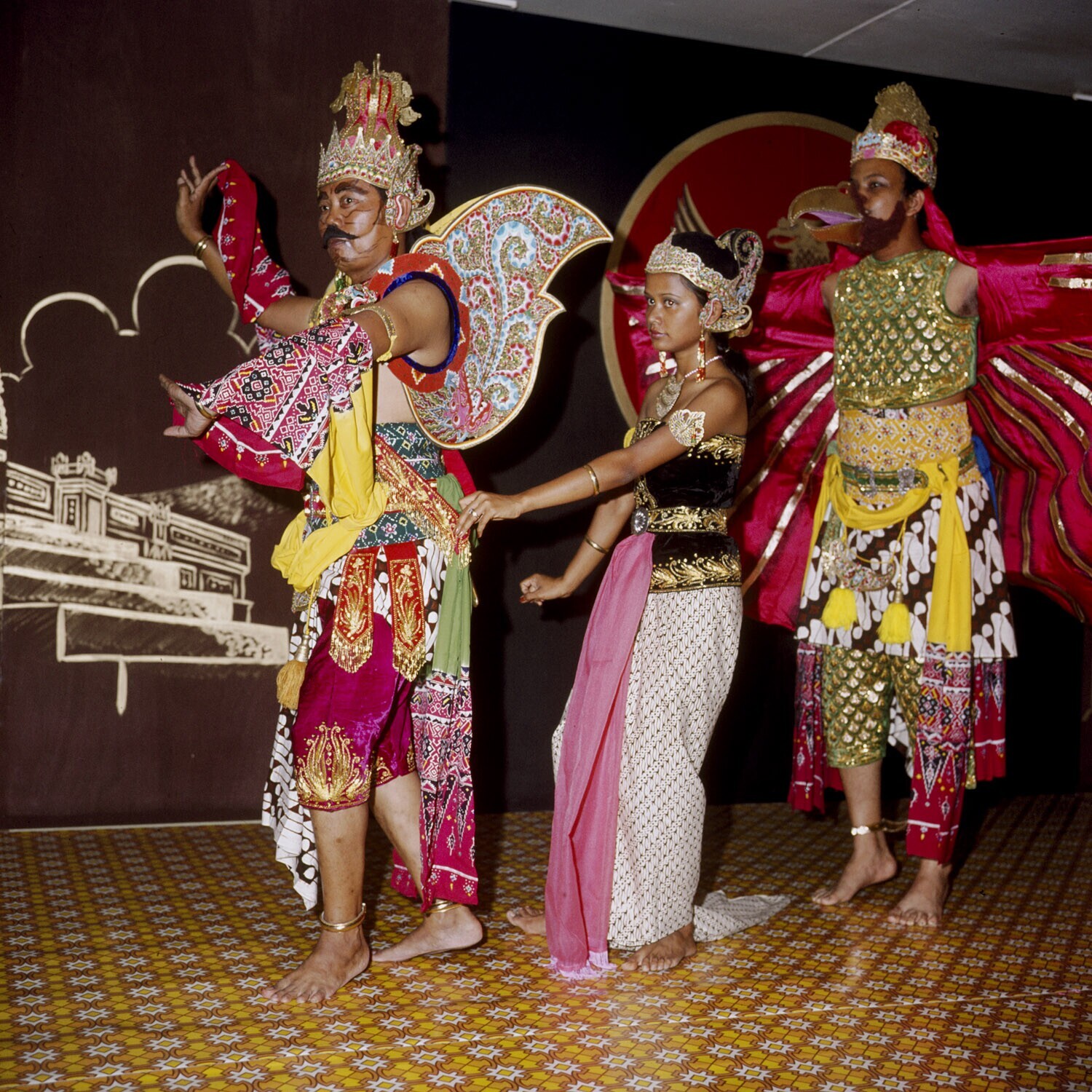 Dansinstructie aan Surinaamse jongeren door een Javaanse instructeur, die voor dit doel overgekomen is.