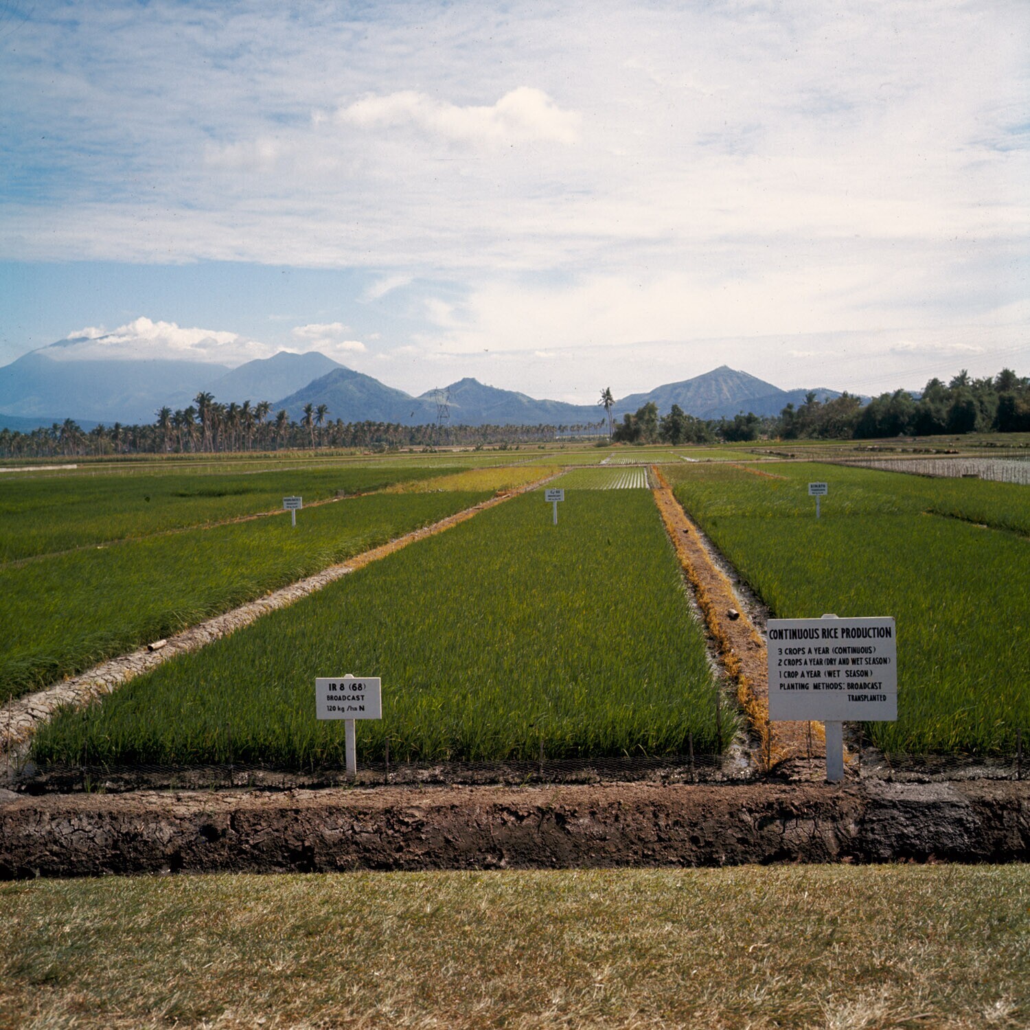 Proefvelden van het IRRI (International Rice Research Institute), Los Baños, Luzon De opvallendste eigenschap van deze nieuwe rijstvariëteit (IR ) is de goede reactie op zware stikstofbemesting.