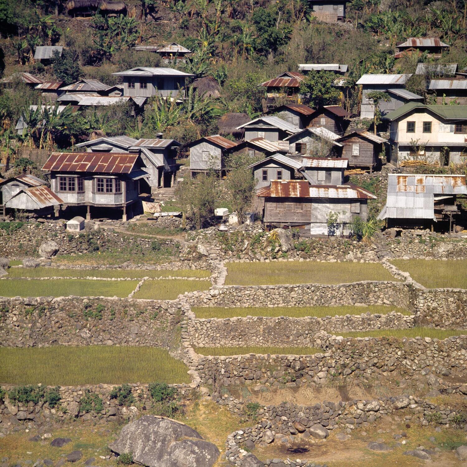 Het dorpje (bario=barananguay) Sabangan in de Mountain provincie, Luzon Rijstterrassen met stenen muurtjes rond het dorpje.