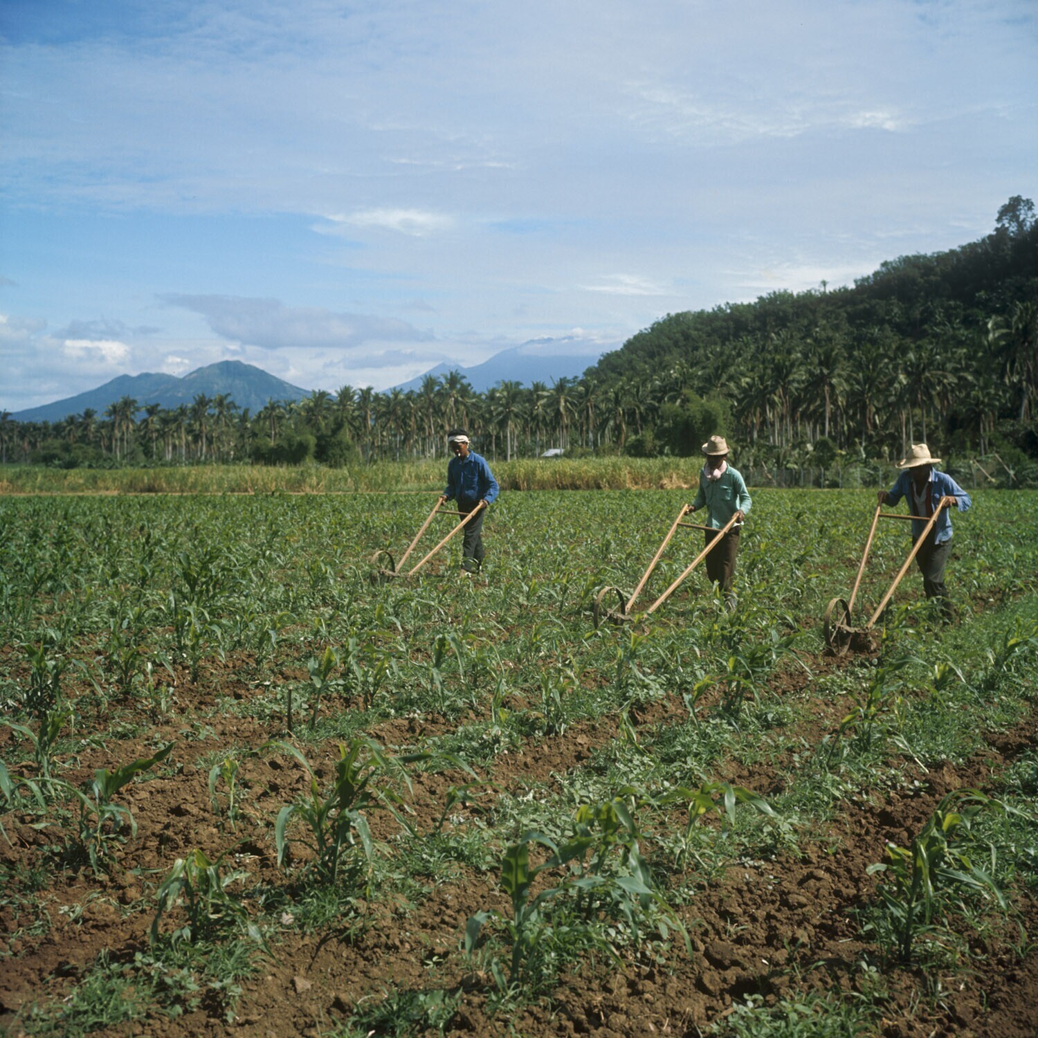 Maisaanplant op het proefveldenkomplex van de UPCA (University of the Phillipean Colleges of Agriculture) wordt met schoffelwerktuig tussen de rijen van onkruid vrijgemaakt. Los Baños, Laguna provincie, Luzon