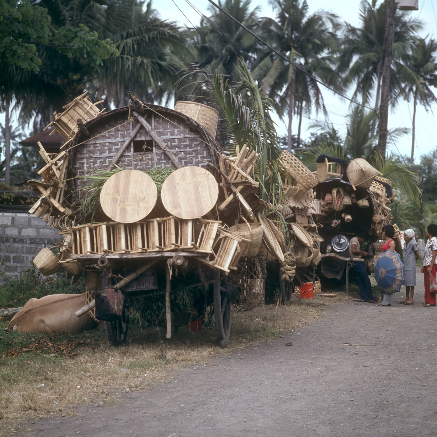 De verkoop van gevlochten en uit hout vervaardigde huishoudelijke artikelen langs de weg van Calamba naar Los Banas, Laguna provincie, Luzon