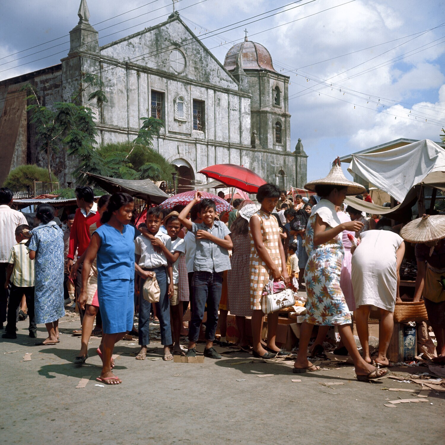 Mensen op de markt tijdens het jaarlijkse feest van de patroonheilige van Carmona. Op de achtergrond een uit de Spaanse tijd daterende kerk. Cavite provincie, Luzon.