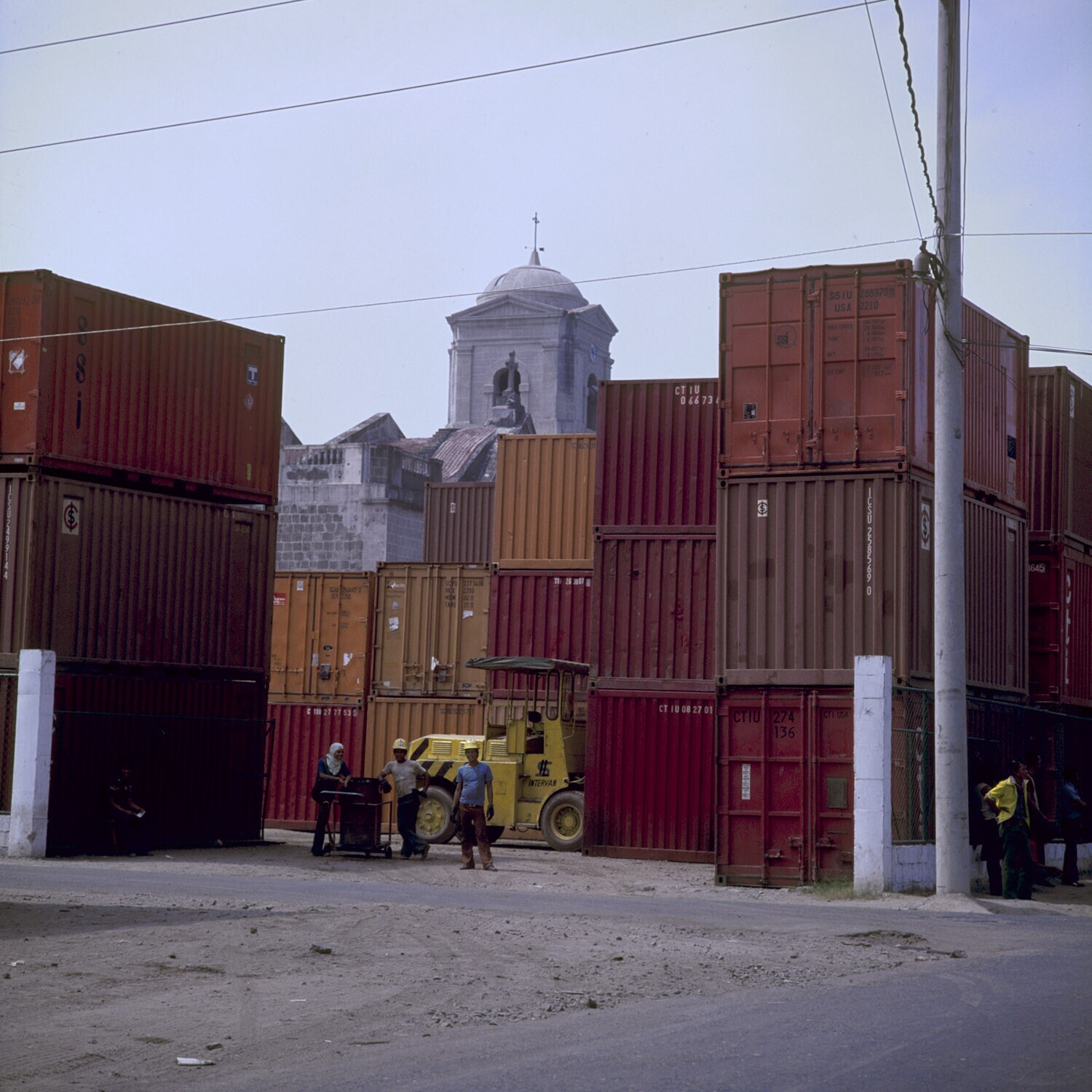 De San Sebastian kathedraal omringd met containers van vrachtvervoersmaatschappijen die daar gevestigd zijn. Intramuros area Manila, Rizal provincie, Luzon.