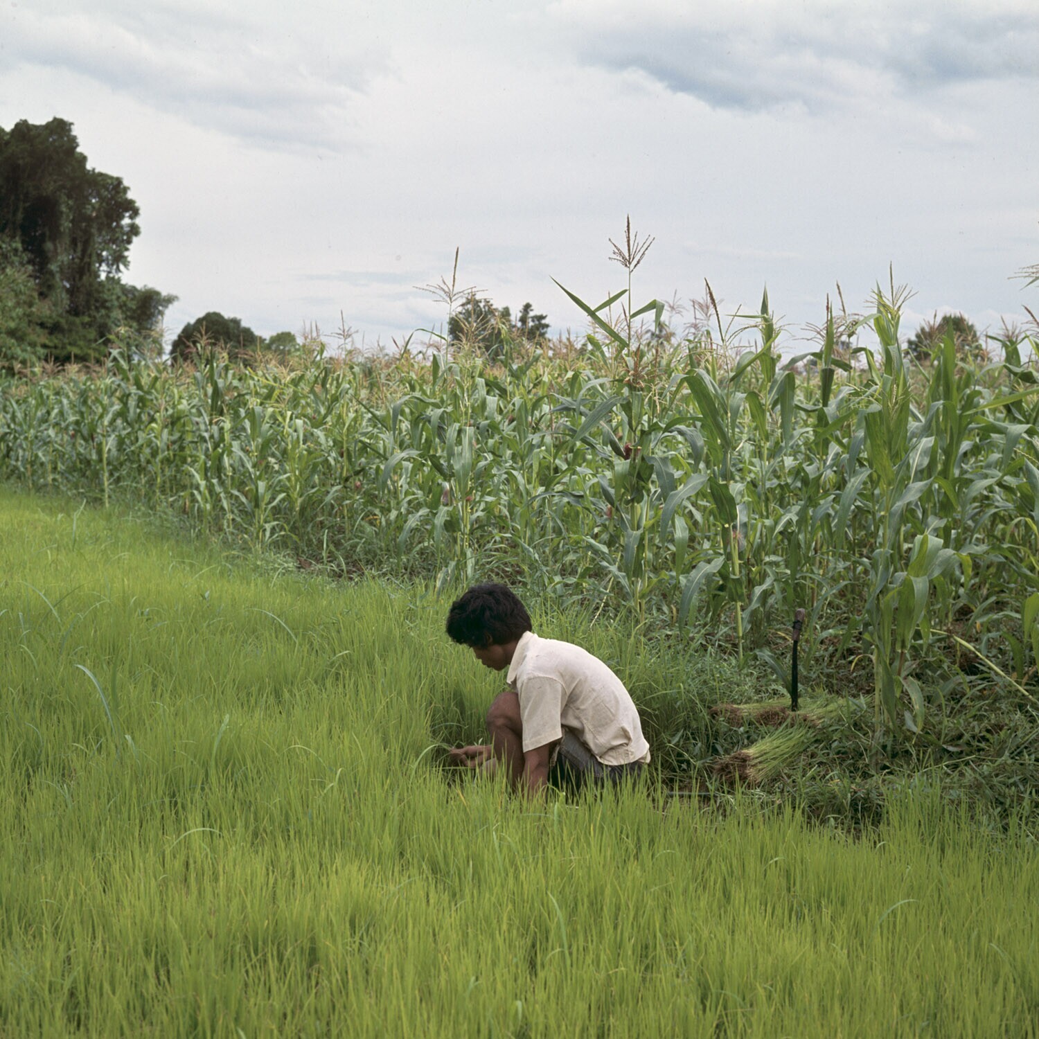 Het uittrekken van rijstzaailingen bestemd voor overplanten, de Angus rivier vallei, Mindanao. Simuloa rivier projectgebied.