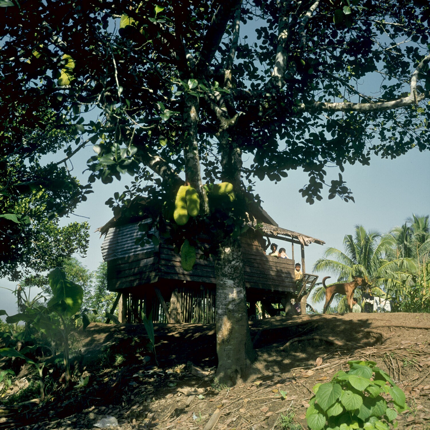 Boerenwoning met Nangkaboom op de voorgrond. Agusan riviervallei, Mindanao.