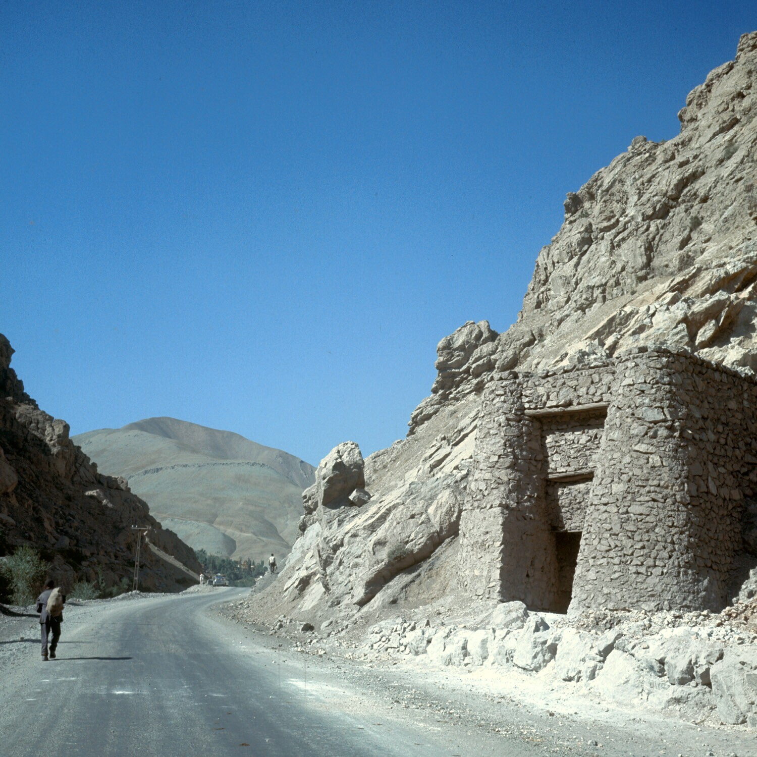 Schachtbouw van koperoven bij weg door Elburzgebergte in Noord Iran