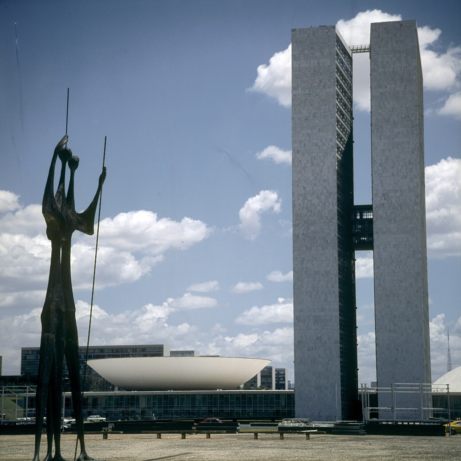 Het beeld 'Os Guerreiros' naast het gebouw van het Nationaal Congres van Brazilië