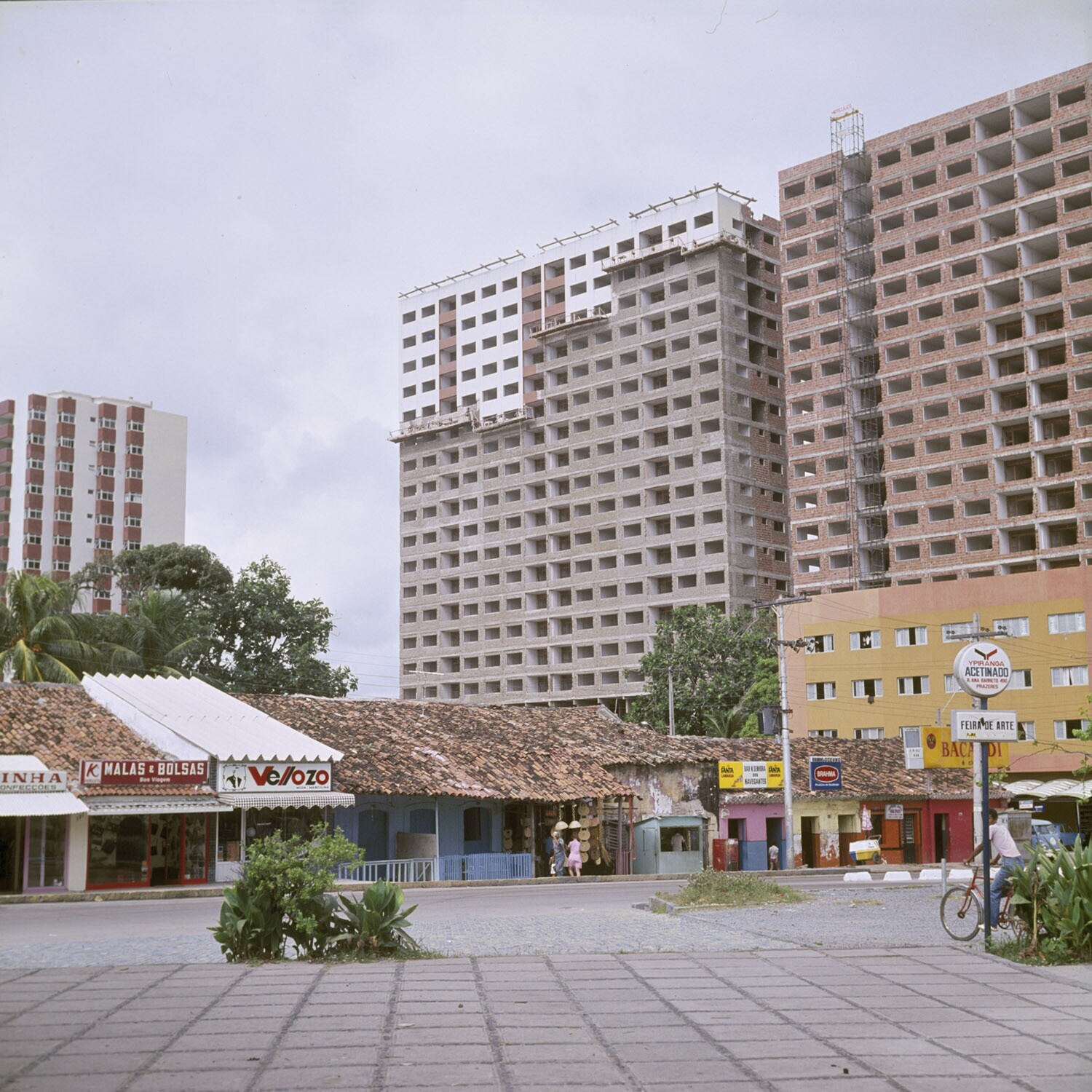 De Boa Viagem met oude huizen, winkels en de nieuwbouw voornamelijk hotels op de achtergrond, Recife.