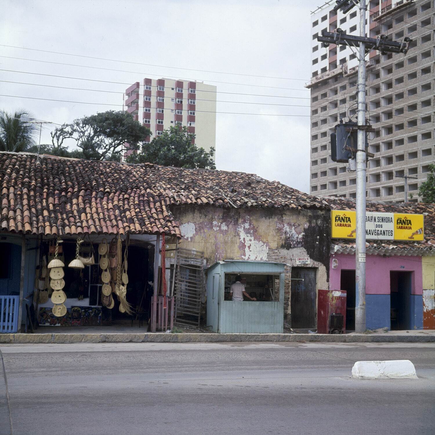 De Boa Viagem met oude huizen, winkels en de nieuwbouw voornamelijk hotels op de achtergrond, Recife.