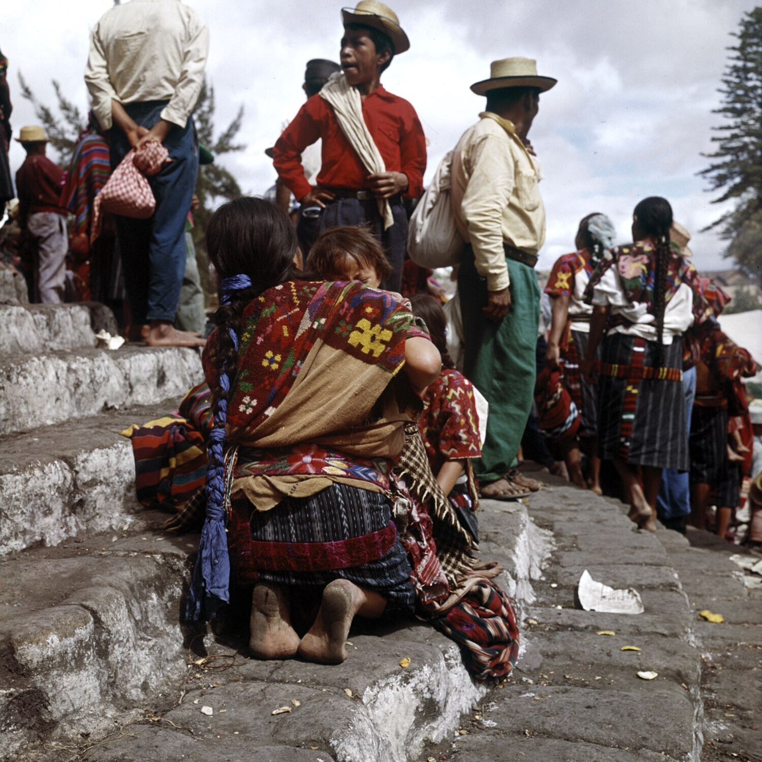 K'iche' vrouw met kind op de trappen van de Iglesia de Santo Tomás in Chichicastenango