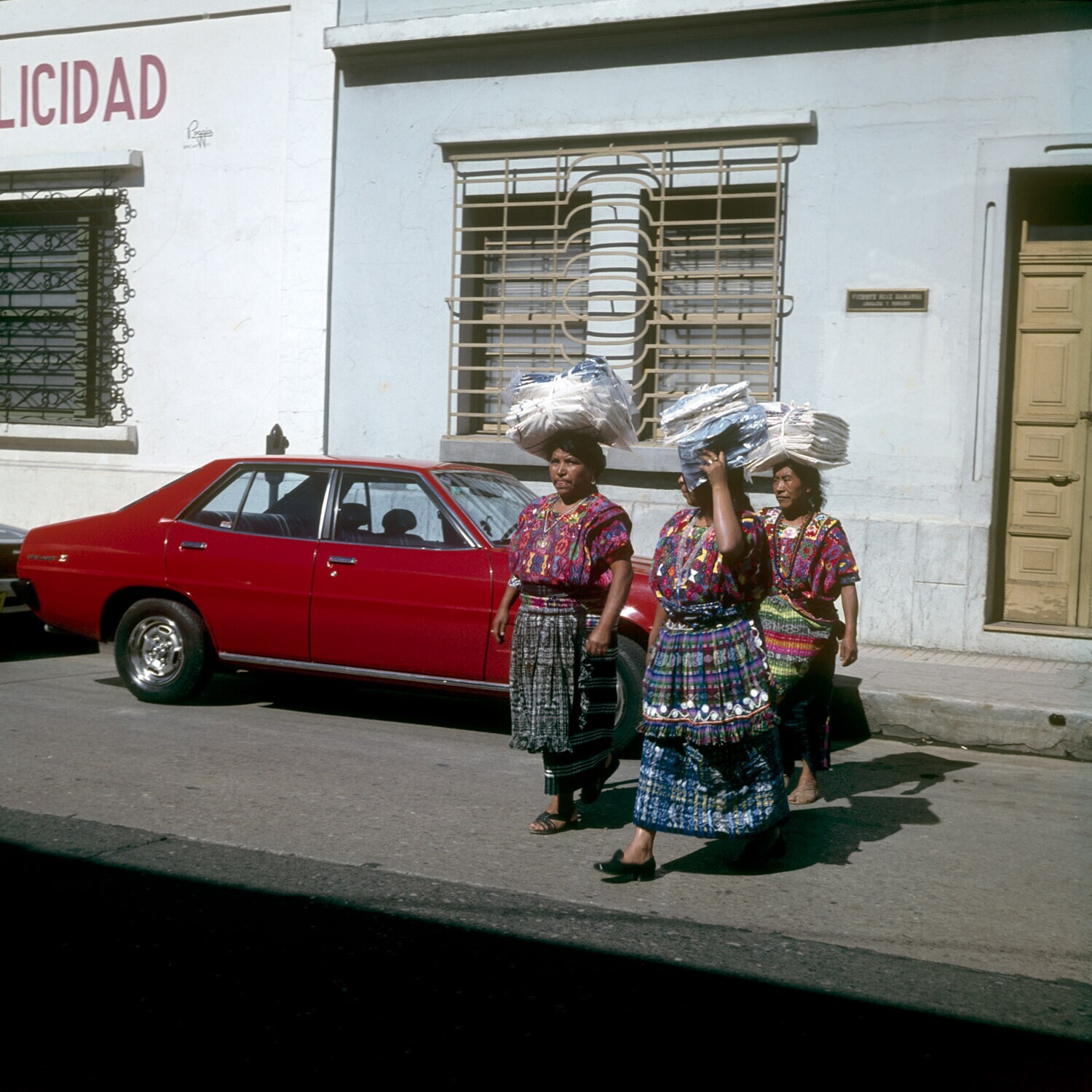 Maya vrouwen steken de straat over in Guatemala-Stad (Ciudad de Guatemala)