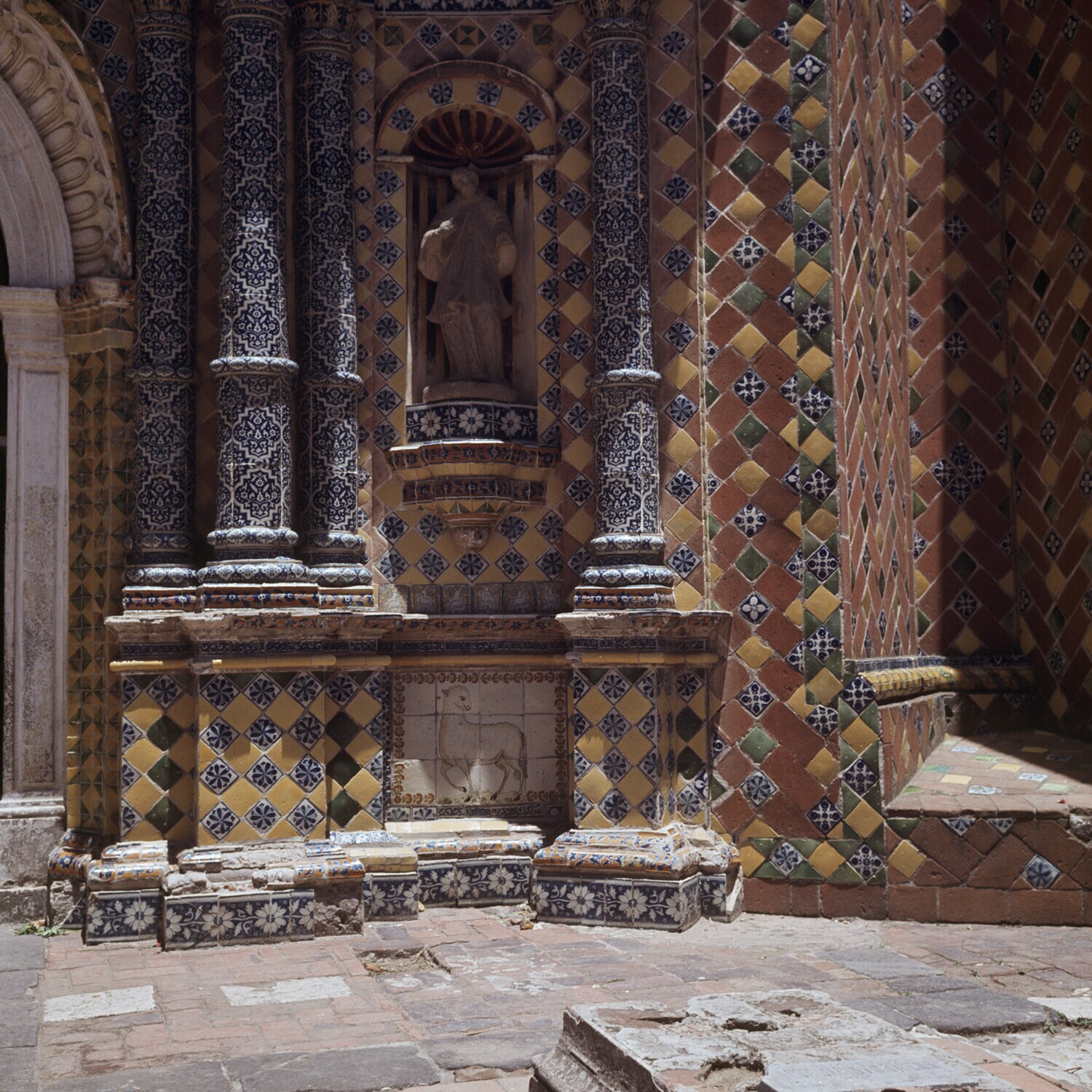 Detail van het exterieur van de Templo de San Francisco Acatepec met zijn gevel van Talavera mozaïeken en rode baksteen