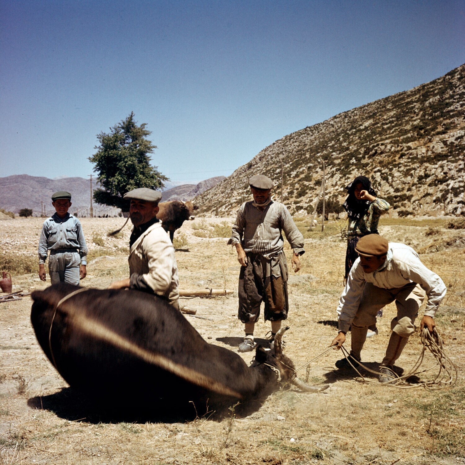 Een os wordt vastgebonden en op de grond gelegd om beslagen te worden