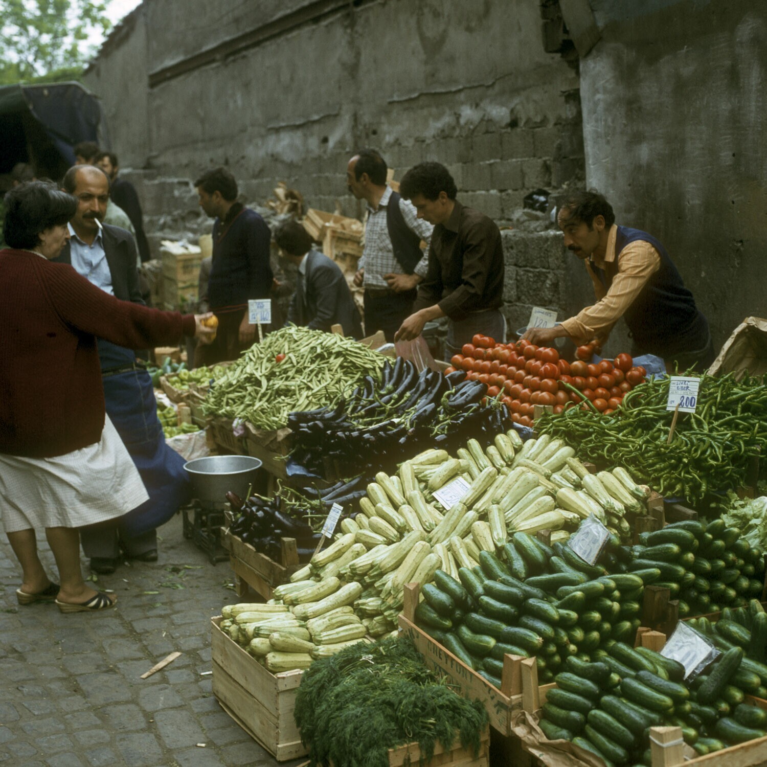 Istanbul, de groentenmarkt, met van voor naar achteren komkommers,gourgett is,groene pepers aubergines,tomaten,bonen