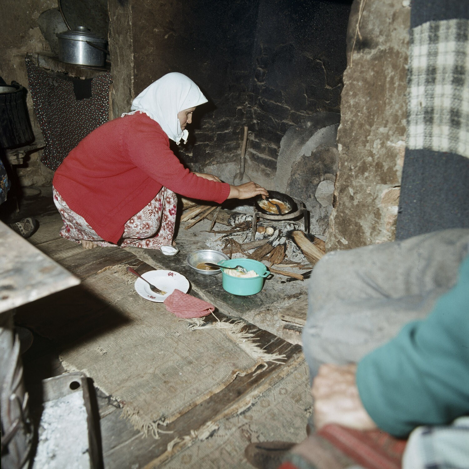 Sinop, de keuken van de boederij, de boerin bakt hier eieren voor de gasten, het enige meubilair is een muurbank Het eten gebeurd zittend op de vloer