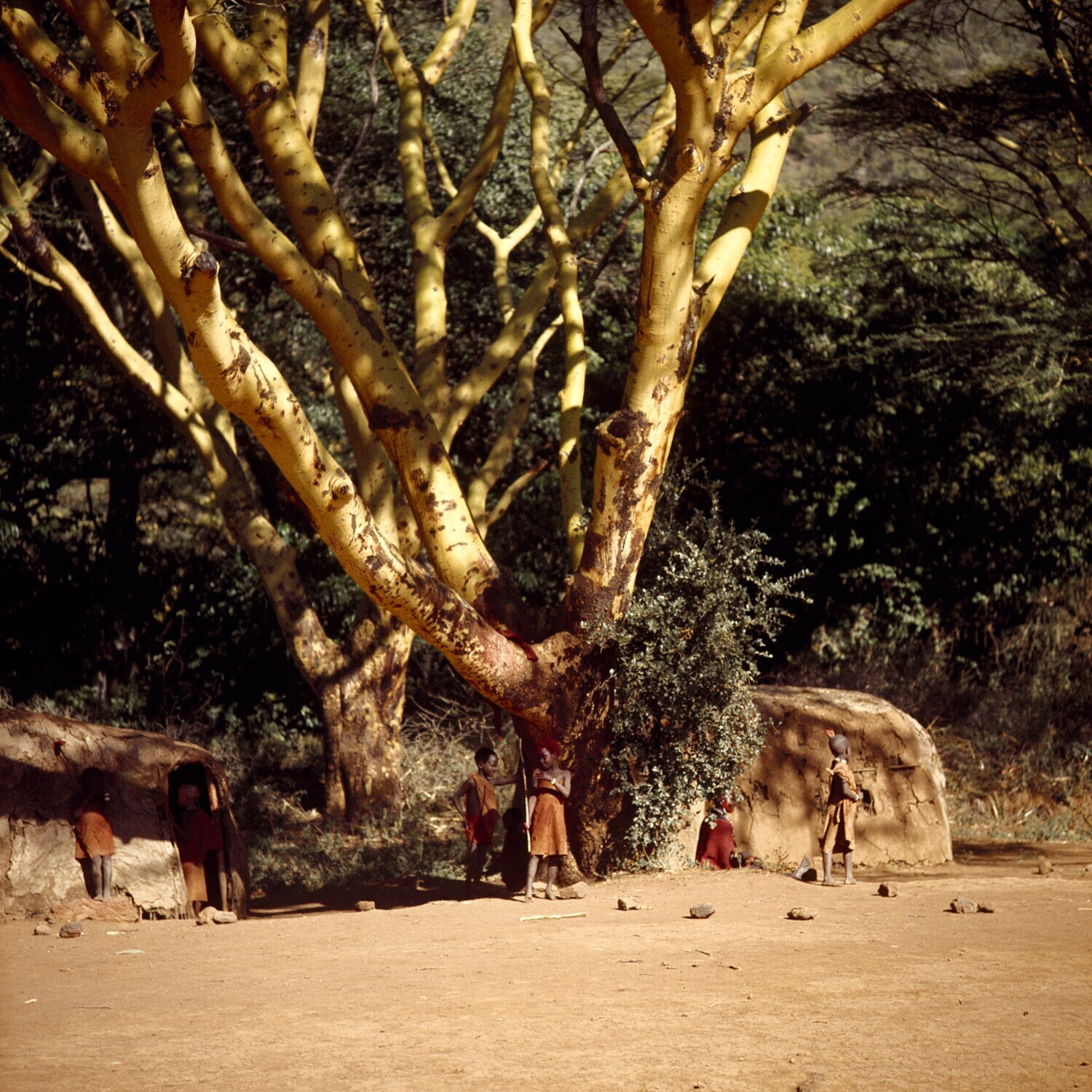 Masai hutten onder de acacia bomen